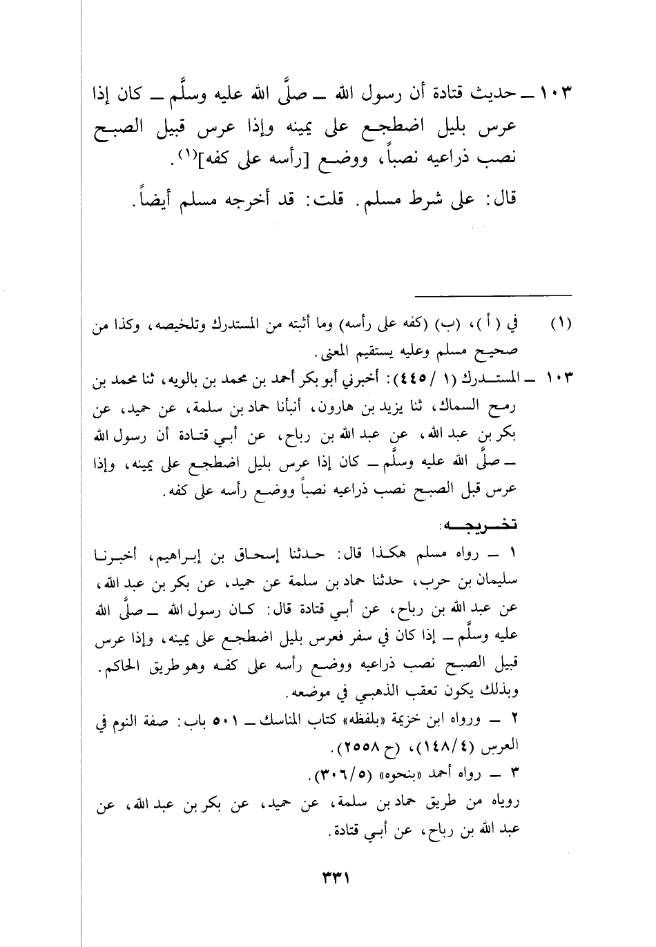103 - المستدرك (1/ 445): أخبرني أبو بكر أحمد بن محمد بن بالويه، ثنا محمد بن رمح السماك، ثنا يزيد بن هارون، أنبأنا حماد بن سلمة، عن حميد، عن بكر بن عبد الله، عن عبد الله بن رباح، عن أبي قتادة أن رسول الله -صلى الله عليه وسلم- كان إذا عرس بليل اضطجع على يمينه، وإذا عرس قبل الصبح نصب ذراعيه نصباً ووضع رأسه على كفه.