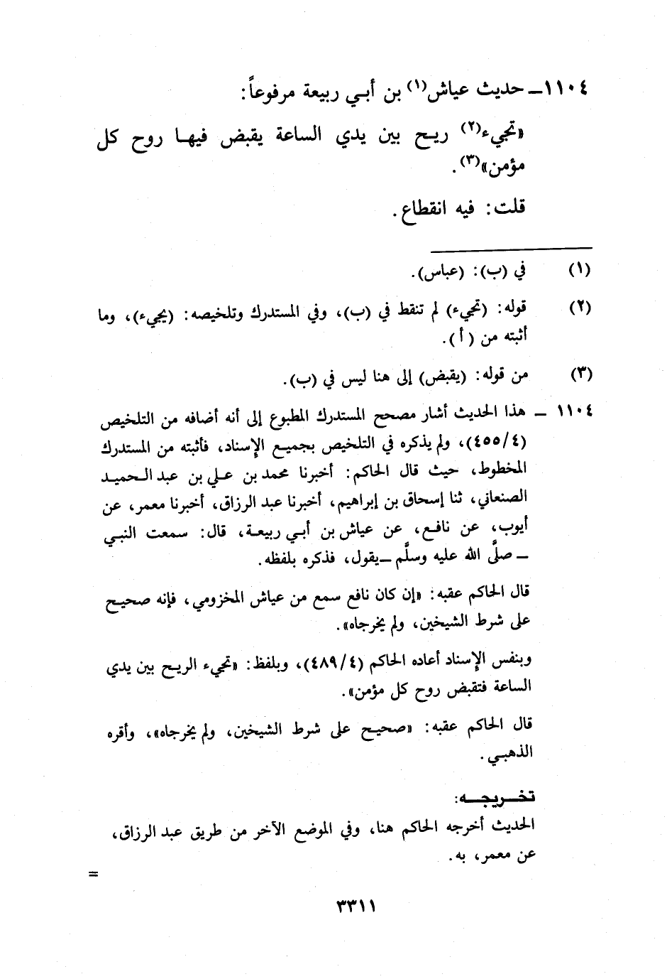 1104 - هذا الحديث أشار مصحح المستدرك المطبوع إلى أنه أضافه من التلخيص (4/ 455)، ولم يذكره في التلخيص بجميع الإسناد، فأثبته من المستدرك المخطوط، حيث قال الحاكم: أخبرنا محمد بن علي بن عبد الحميد الصنعاني، ثنا إسحاق بن إبراهيم، أخبرنا عبد الرزاق، أخبرنا معمر، عن أيوب، عن نافع، عن عياش بن أبي ربيعة، قال: سمعت النبي -صلى الله عليه وسلم- يقول، فذكره بلفظه.