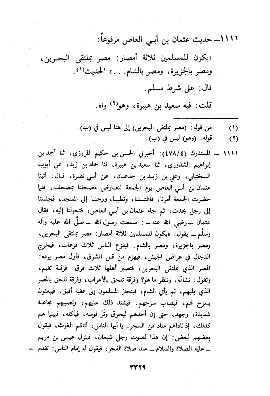 1111 - المستدرك (4/ 478): أخبرني الحسن بن حكيم المروزي، ثنا أحمد بن إبراهيم الشذوري، ثنا سعيد بن هبيرة، ثنا حماد بن زيد، عن أيوب السختياني، وعلي بن زيد بن جدعان، عن أبي نضرة، قال: أتينا عثمان بن أبي العاص يوم الجمعة لنعارض مصحفنا بمصحفه، فلما حضرت الجمعة أمرنا، فاغتسلنا، وتطيبنا، ورحنا إلى المسجد، فجلسنا إلى رجل يحدث، ثم جاء عثمان بن أبي العاص، فتحولنا إليه، فقال عثمان -رضي الله عنه-: سمعت رسول الله -صلى الله عليه وآله وسلم- يقول: "يكون للمسلمين ثلاثة أمصار: مصر بملتقى البحرين، ومصر بالجزيرة، ومصر بالشام. فيفزع الناس ثلاث فزعات، فيخرج الدجال في عراض الجيش، فيهزم من قبل المشرق، فأول مصر يرده: المصر الذي بملتقى البحرين، فتصير أهلها ثلاث فرق: فرقة تقيم، وتقول: نشامّه، وننظر ما هو؟ وفرقة تلحق بالأعراب، وفرقة تلحق بالمصر الذي يليهم، ثم يأتي الشام، فينحاز المسلمون إلى عقبة أفيق، فيبعثون بسرح لهم، فيصاب سرحهم، فيشتد ذلك عليهم، وتصيبهم مجاعة شديدة، وجهد، حتى إن أحدهم ليحرق وَتَرَ قوسه، فيأكله، فبينما هم كذلك، إذ ناداهم مناد من السحر: يا أيها الناس، أتاكم الغوث، فيقول بعضهم لبعض: إن هذا لصوت رجل شبعان، فينزل عيسى بن مريم -عليه الصلاة والسلام- عند صلاة الفجر، فيقول له إمام الناس: تقدم =