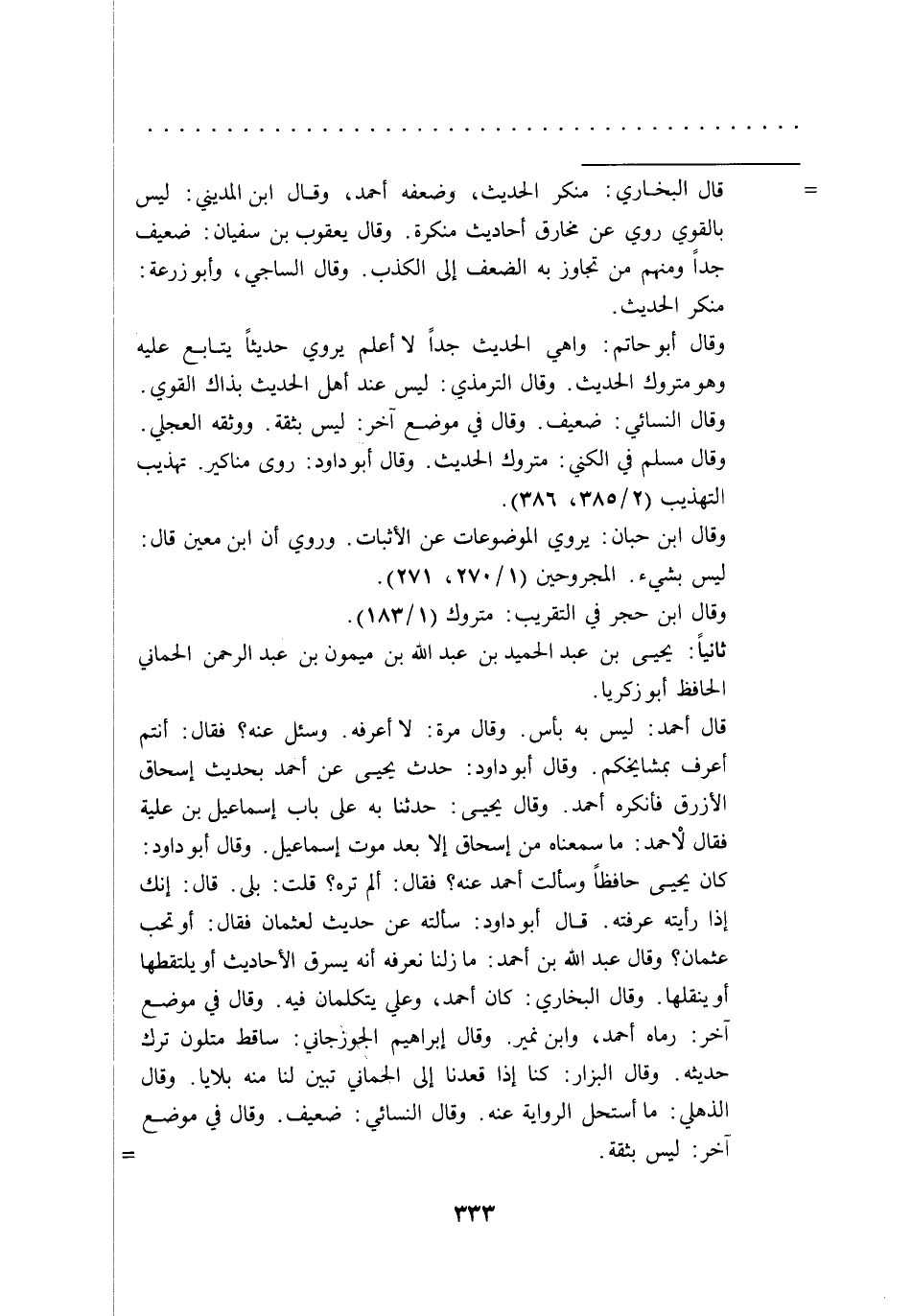 قال أحمد: ليس به بأس. وقال مرة: لا أعرفه. وسئل عنه؟ فقال: أنتم أعرف بمشايخكم. وقال أبو داود: حدث يحيى عن أحمد بحديث إسحاق الأزرق فأنكره أحمد. وقال يحيى: حدثنا به على باب إسماعيل بن علية فقال لأحمد: ما سمعناه من إسحاق إلا بعد موت إسماعيل. وقال أبو داود: كان يحيى حافظاً وسألت أحمد عنه؟ فقال: ألم تره؟ قلت: بلى. قال: إنك إذا رأيته عرفته. قال أبو داود: سألته عن حديث لعثمان فقال: أو تحب عثمان؟ وقال عبد الله بن أحمد: ما زلنا نعرفه أنه يسرق الأحاديث أو يلتقطها أو ينقلها. وقال البخاري: كان أحمد، وعلي يتكلمان فيه. وقال في موضع آخر: رماه أحمد، وابن نمير. وقال إبراهيم الجوزجاني: ساقط متلون ترك حديثه. وقال البزار: كنا إذا قعدنا إلى الجماني تبين لنا منه بلايا. وقال الذهلي: ما أستحل الرواية عنه. وقال النسائي: ضعيف. وقال في موضع آخر: ليس بثقة. =