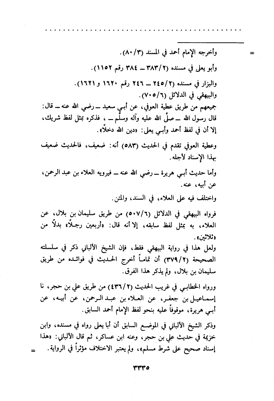 جميعهم من طريق عطية العوفي، عن أبي سعيد -رضي الله عنه- قال: قال رسول الله -صلى الله عليه وآله وسلم-، فذكره بمثل لفظ شريك، إلا أن في لفظ أحمد وأبي يعلى: "دين الله دخلاً".