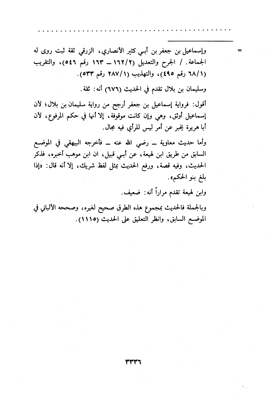أقول: فرواية إسماعيل بن جعفر أرجح من رواية سليمان بن بلال؛ لأن إسماعيل أوثق، وهي وإن كانت موقوفة، إلا أنها في حكم المرفوع، لأن أبا هريرة يخبر عن أمر ليس للرأي فيه مجال.