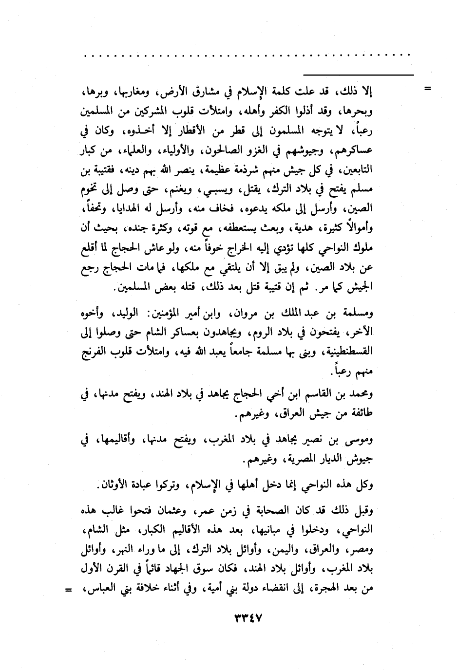 وقبل ذلك قد كان الصحابة في زمن عمر، وعثمان فتحوا غالب هذه النواحي، ودخلوا في مبانيها، بعد هذه الأقاليم الكبار، مثل الشام، ومصر، والعراق، واليمن، وأوائل بلاد الترك، إلى ما وراء النهر، وأوائل بلاد المغرب، وأوائل بلاد الهند، فكان سوق الجهاد قائماً في القرن الأول من بعد الهجرة، إلى انقضاء دولة بني أمية، وفي أثناء خلافة بني العباس، =