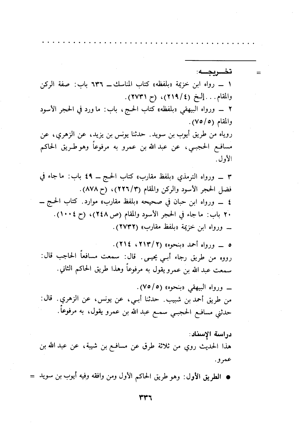 رووه من طريق رجاء أبي يحيى. قال: سمعت مسافعاً الحاجب قال: سمعت عبد الله بن عمرو يقول به مرفوعاً وهذا طريق الحاكم الثاني.