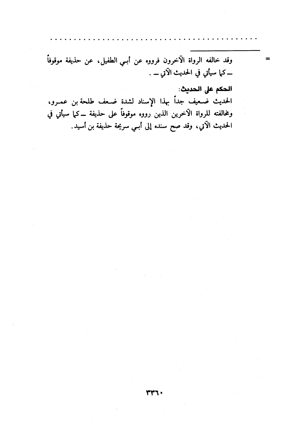 الحديث ضعيف جداً بهذا الإسناد لشدة ضعف طلحة بن عمرو، ومخالفته للرواة الآخرين الذين رووه موقوفاً على حذيفة -كما سيأتي في الحديث الآتي، وقد صح سنده إلى أبي سريحة حذيفة بن أسيد.