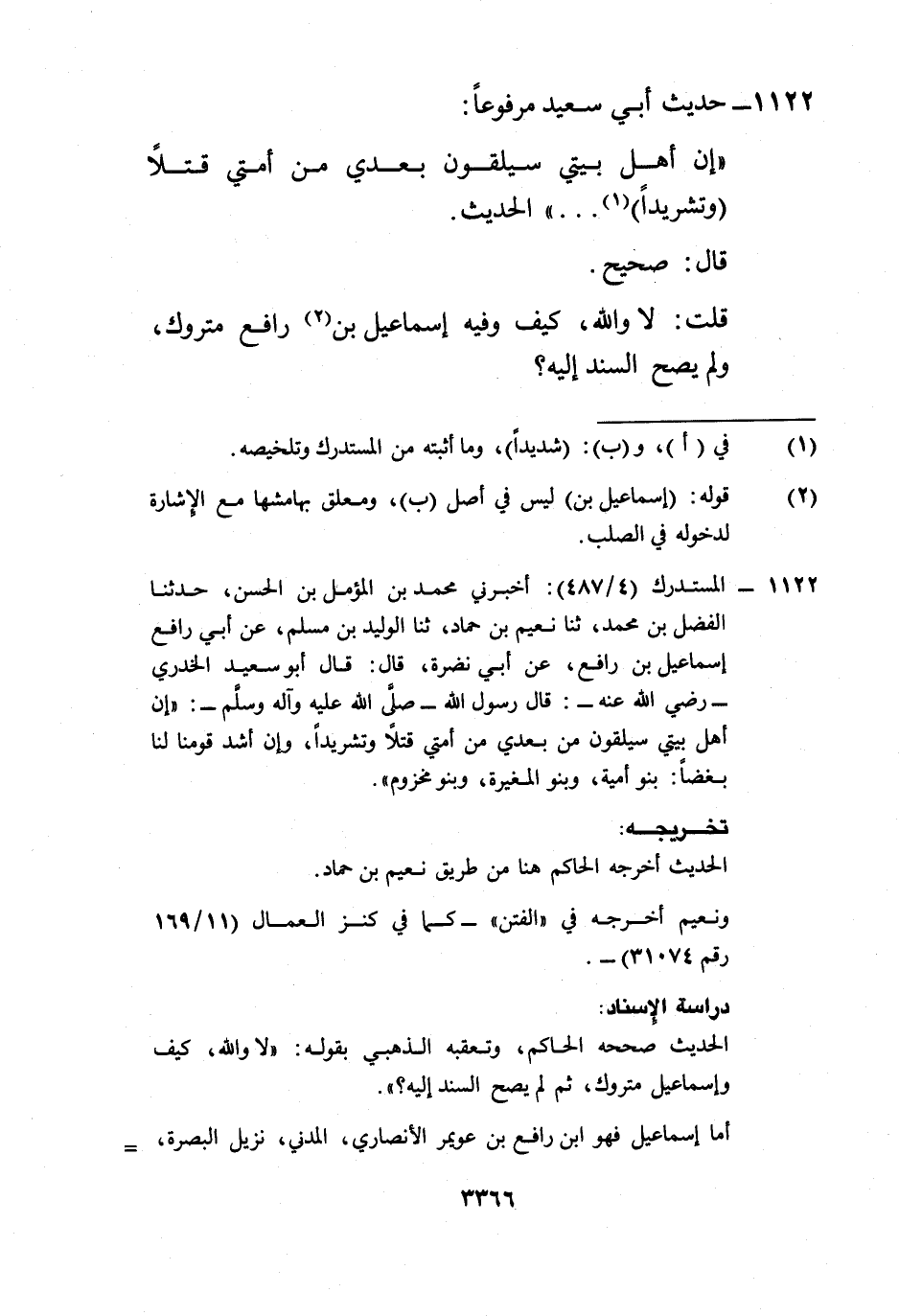 1122 - المستدرك (4/ 487): أخبرني محمد بن المؤمل بن الحسن، حدثنا الفضل بن محمد، ثنا نعيم بن حماد، ثنا الوليد بن مسلم، عن أبي رافع إسماعيل بن رافع، عن أبي نضرة، قال: قال أبو سعيد الخدري -رضي الله عنه-: قال رسول الله -صلى الله عليه وآله وسلم-: "إن أهل بيتي سيلقون من بعدي من أمتي قتلاً وتشريداً، وإن أشد قومنا لنا بغضاً: بنو أمية، وبنو المغيرة، وبنو مخزوم".
