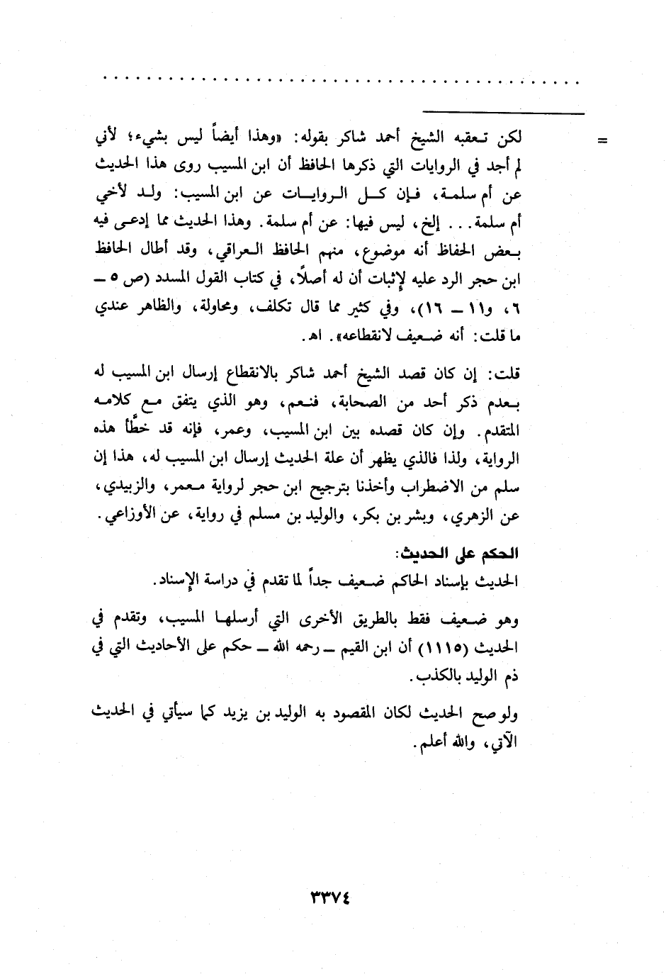 = لكن تعقبه الشيخ أحمد شاكر بقوله: "وهذا أيضاً ليس بشيء؛ لأني لم أجد في الروايات التي ذكرها الحافظ أن ابن المسيب روى هذا الحديث عن أم سلمة، فإن على الروايات عن ابن المسيب: ولد لأخي أم سلمة ... الخ، ليس فيها: عن أم سلمة. وهذا الحديث مما إدعى فيه بعض الحفاظ أنه موضوع، منهم الحافظ العراقي، وقد أطال الحافظ ابن حجر الرد عليه لإثبات أن له أصلاً، في كتاب القول المسدد (ص 5 - 6، و11 - 16)، وفي كثير مما قال تكلف، ومحاولة، والظاهر عندي ما قلت: أنه ضعيف لانقطاعه". اهـ.