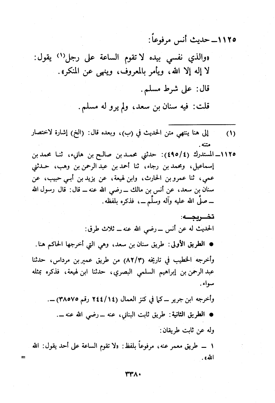 1125 - المستدرك (4/ 495): حدثني محمد بن صالح بن هانيء، ثنا محمد بن إسماعيل، ومحمد بن رجاء، ثنا أحمد بن عبد الرحمن بن وهب، حدثني عمي، ثنا عمرو بن الحارث، وابن لهيعة، عن يزيد بن أبي حبيب، عن سنان بن سعد، عن أنس بن مالك -رضي الله عنه- قال: قال رسول الله -صلى الله عليه وآله وسلم-، فذكره بلفظه.