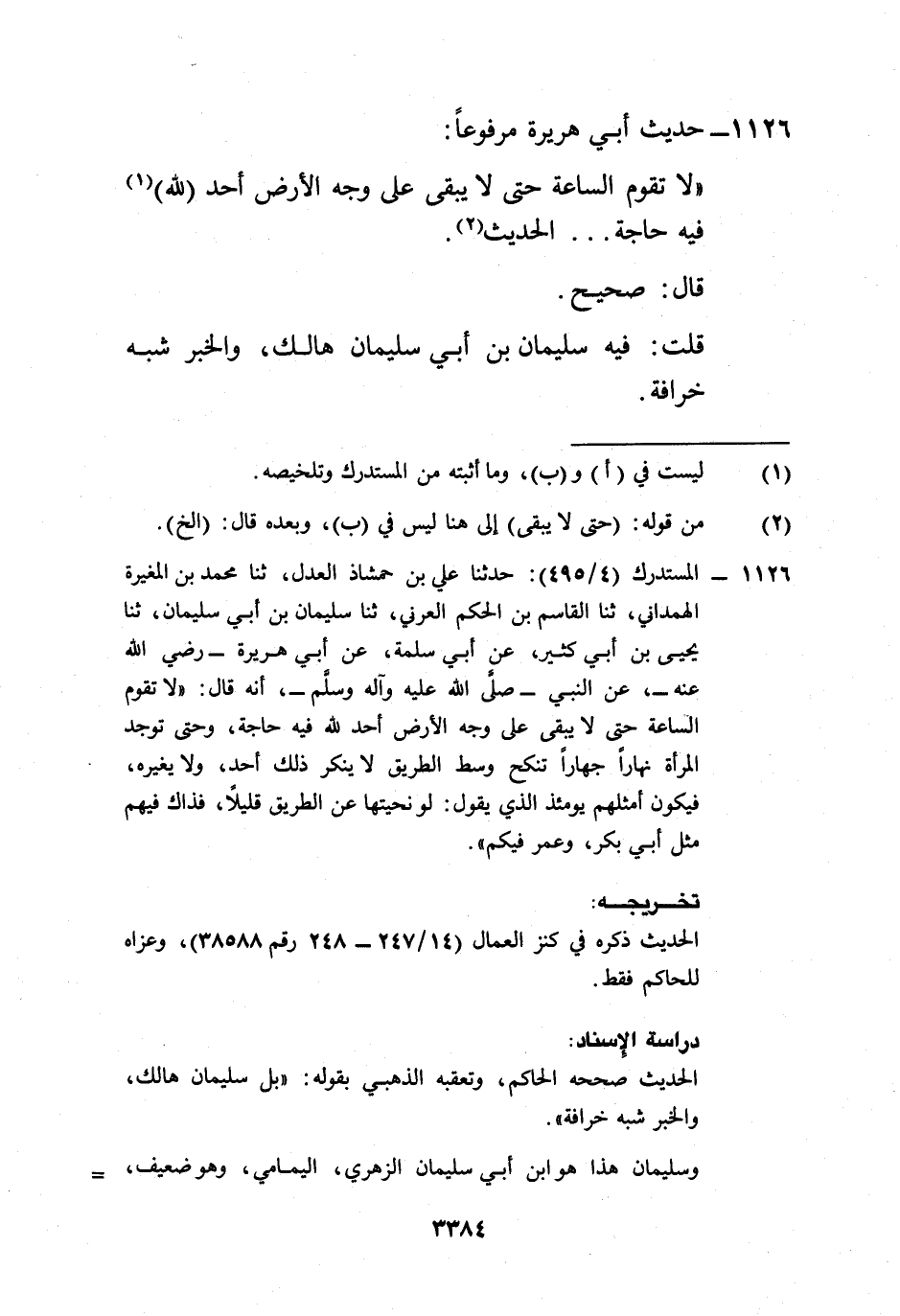 1126 - المستدرك (4/ 495): حدثنا علي بن حمشاذ العدل، ثنا محمد بن المغيرة الهمداني، ثنا القاسم بن الحكم العرني، ثنا سليمان بن أبي سليمان، ثنا يحيى بن أبي كثير، عن أبي سلمة، عن أبي هريرة -رضي الله عنه-، عن النبي -صلى الله عليه وآله وسلم-، أنه قال: "لا تقوم الساعة حتى لا يبقى على وجه الأرض أحد لله فيه حاجة، وحتى توجد المرأة نهاراً جهاراً تنكح وسط الطريق لا ينكر ذلك أحد، ولا يغيره، فيكون أمثلهم يومئذ الذي يقول: لو نحيتها عن الطريق قليلاً، فذاك فيهم مثل أبي بكر، وعمر فيكم".