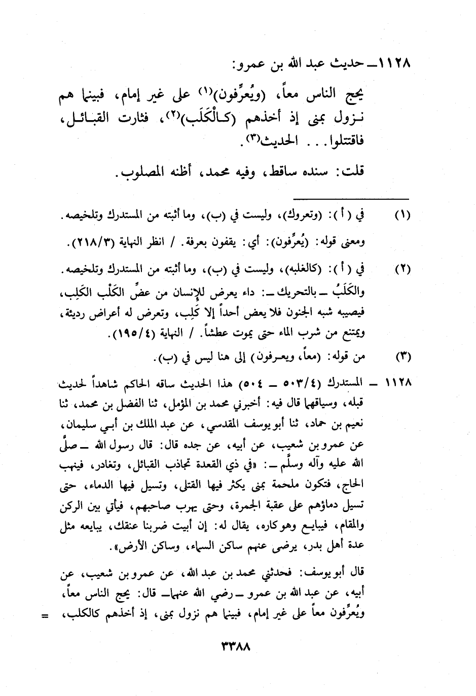 1128 - المستدرك (4/ 503 - 504) هذا الحديث ساقه الحاكم شاهداً لحديث قبله، وسياقهما قال فيه: أخبرني محمد بن المؤمل، ثنا الفضل بن محمد، ثنا نعيم بن حماد، ثنا أبو يوسف المقدسي، عن عبد الملك بن أبي سليمان، عن عمرو بن شعيب، عن أبيه، عن جده قال: قال رسول الله -صلى الله عليه وآله وسلم-: "في ذي القعدة تجاذب القبائل، وتغادر، فينهب الحاج، فتكون ملحمة بمنى يكثر فيها القتلى، وتسيل فيها الدماء، حتى تسيل دماؤهم على عقبة الجمرة، وحتى يهرب صاحبهم، فيأتي بين الركن والمقام، فيبايع وهو كاره، يقال له: إن أبيت ضربنا عنقك، يبايعه مثل عدة أهل بدر، يرضى عنهم ساكن السماء، وساكن الأرض".