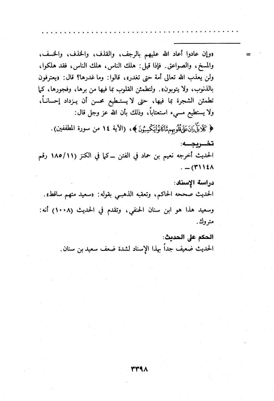 = "وإن عادوا أعاد الله عليهم بالرجف، والقذف، والخذف، والخسف، والمسخ، والصواعق. فإذا قيل: هلك الناس، هلك الناس، فقد هلكوا، ولن يعذب الله تعالى أمة حتى تغدر"، قالوا: وما غدرها؟ قال: "يعترفون بالذنوب، ولا يتوبون". ولتطمئن القلوب بما فيها من برها، وفجورها، كما تطمئن الشجرة بما فيها، حتى لا يستطيع محسن أن يزداد إحساناً، ولا يستطيع مسيء استعتاباً، وذلك بأن الله عز وجل قال: