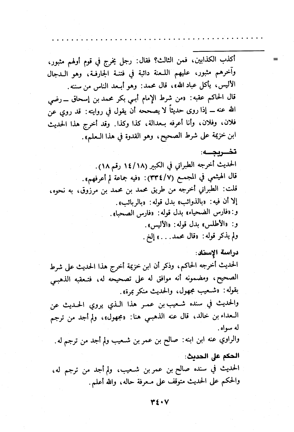 = أكذب الكذابين، فمن الثالث؟ فقال: رجل يخرج في قوم أولهم مثبور، وآخرهم مثبور، عليهم اللعنة دائبة في فتنة الجارفة، وهو الدجال الأليس، يأكل عباد الله"، قال محمد: وهو أبعد الناس من سننه.