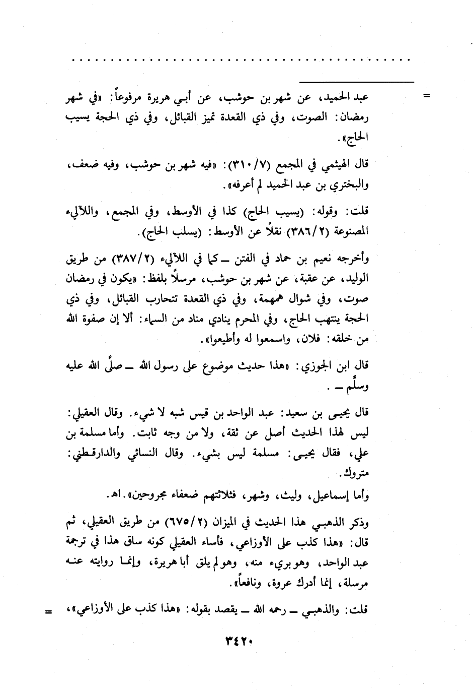 قلت: وقوله: (يسيب الحاج) كذا في الأوسط، وفي المجمع، واللآليء المصنوعة (2/ 386) نقلاً عن الأوسط: (يسلب الحاج).