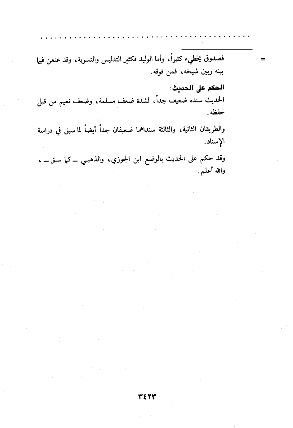 = فصدوق يخطيء كثيراً، وأما الوليد فكثير التدليس والتسوية، وقد عنعن فيما بينه وبين شيخه، فمن فوقه.