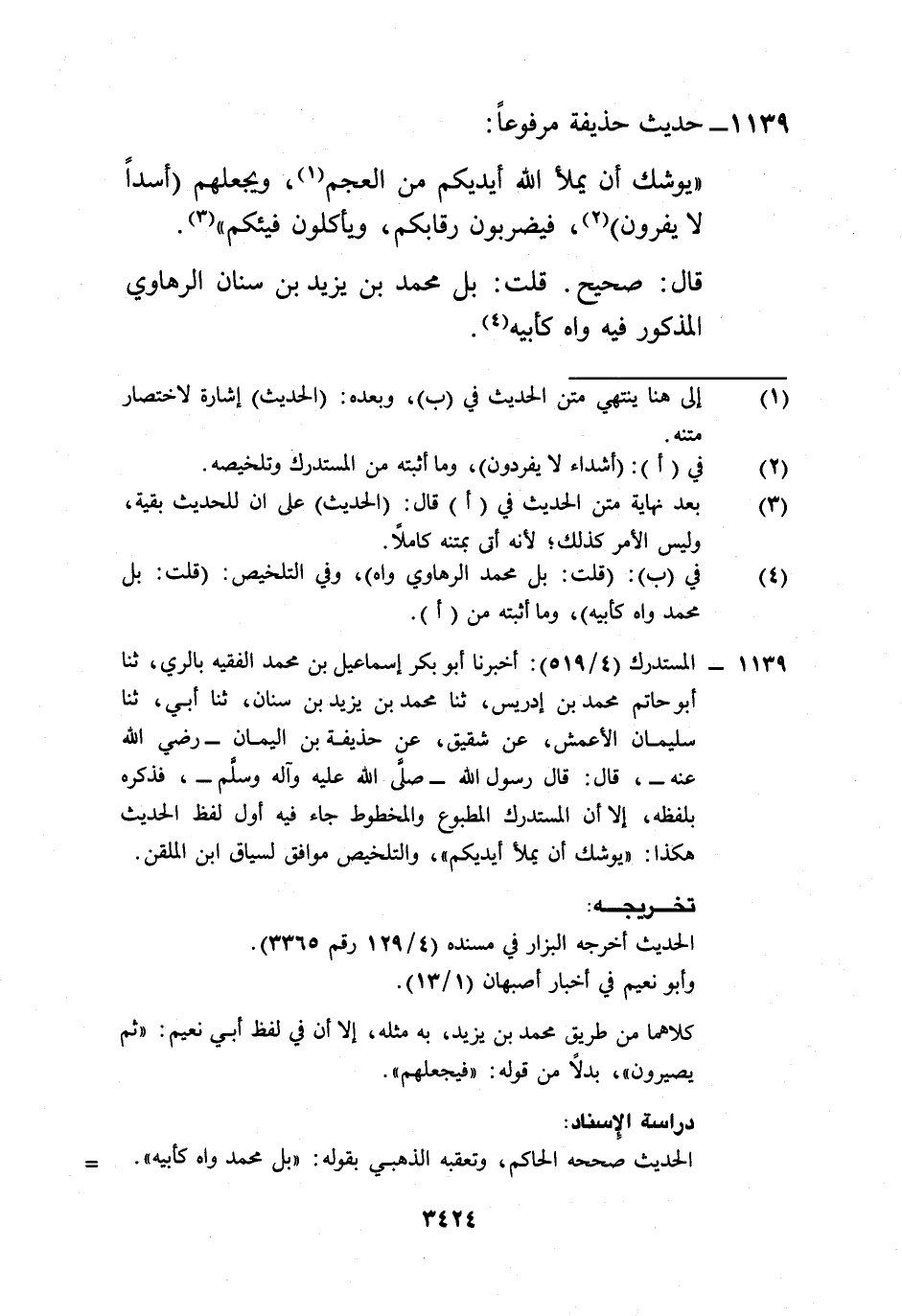 1139 - المستدرك (4/ 519): أخبرنا أبو بكر إسماعيل بن محمد الفقيه بالري، ثنا أبو حاتم محمد بن إدريس، ثنا محمد بن يزيد بن سنان، ثنا أبي، ثنا سليمان الأعمش، عن شقيق، عن حذيفة بن اليمان -رضي الله عنه-، قال: قال رسول الله -صلى الله عليه وآله وسلم-، فذكره بلفظه، إلا أن المستدرك المطبوع والمخطوط جاء فيه أول لفظ الحديث هكذا: "يوشك أن يملأ أيديكم"، والتلخيص موافق لسياق ابن الملقن.