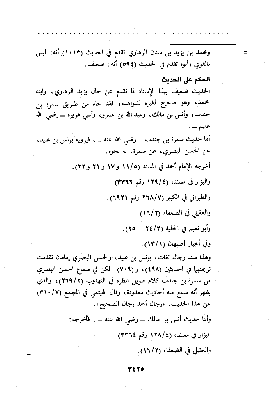 الحديث ضعيف بهذا الِإسناد لما تقدم عن حال يزيد الرهاوي، وابنه محمد، وهو صحيح لغيره لشواهده، فقد جاء من طريق سمرة بن جندب، وأنس بن مالك، وعبد الله بن عمرو، وأبي هريرة -رضي الله عنهم-.