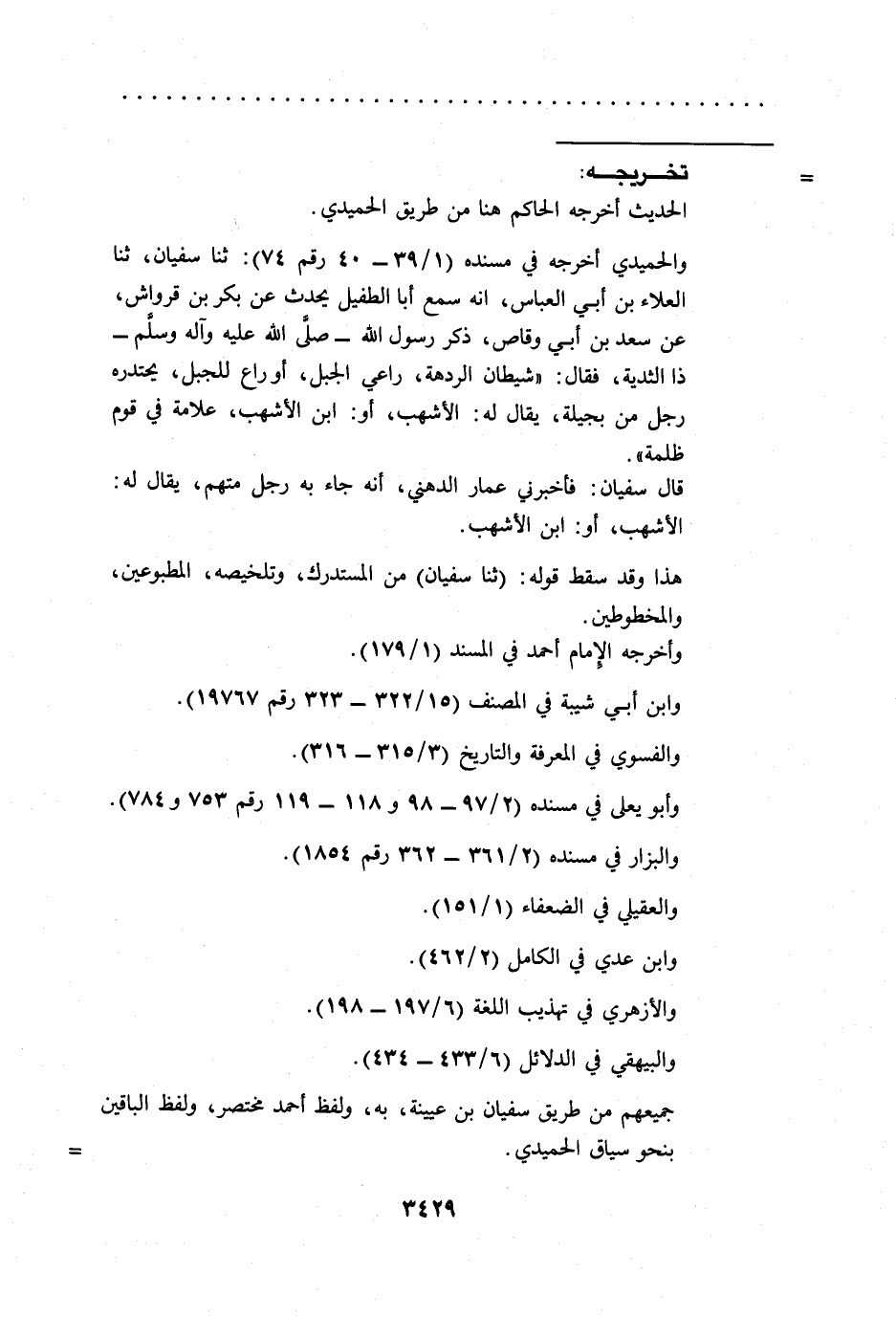 والحميدي أخرجه في مسنده (1/ 39 - 40 رقم 74): ثنا سفيان، ثنا العلاء بن أبي العباس، أنه سمع أبا الطفيل يحدث عن بكر بن قرواش، عن سعد بن أبي وقاص، ذكر رسول الله -صلى الله عليه وآله وسلم- ذا الثدية، فقال: "شيطان الردهة، راعي الجبل، أو راع للجبل، يحتدره رجل من بجيلة، يقال له: الأشهب، أو: ابن الأشهب، علامة في قوم ظلمة".