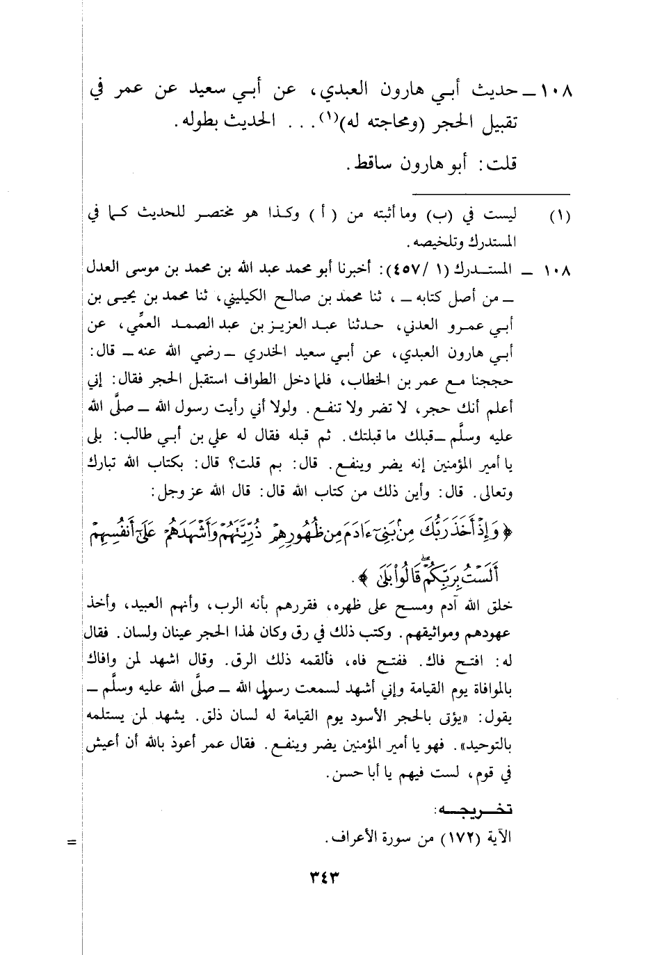 108 - المستدرك (1/ 457): أخبرنا أبو محمد عبد الله بن محمد بن موسى العدل -من أصل كتابه-، ثنا محمد بن صالح الكيليني، ثنا محمد بن يحيى بن أبي عمرو العدني، حدثنا عبد العزيز بن عبد الصمد العمِّي، عن أبي هارون العبدي، عن أبي سعيد الخدري -رضي الله عنه- قال: حججنا مع عمر بن الخطاب، فلما دخل الطواف استقبل الحجر فقال: إني أعلم أنك حجر، لا تضر ولا تنفع. ولولا أني رأيت رسول الله -صلى الله عليه وسلم- قبلك ما قبلتك. ثم قبله فقال له علي بن أبي طالب: بلى يا أمير المؤمنين إنه يضر وينفع. قال: بم قلت؟ قال: بكتاب الله تبارك وتعالى. قال: وأين ذلك من كتاب الله قال: قال الله عز وجل: {وَإِذْ أَخَذَ رَبُّكَ مِنْ بَنِي آدَمَ مِنْ ظُهُورِهِمْ ذُرِّيَّتَهُمْ وَأَشْهَدَهُمْ عَلَى أَنْفُسِهِمْ أَلَسْتُ بِرَبِّكُمْ قَالُوا بَلَى}.