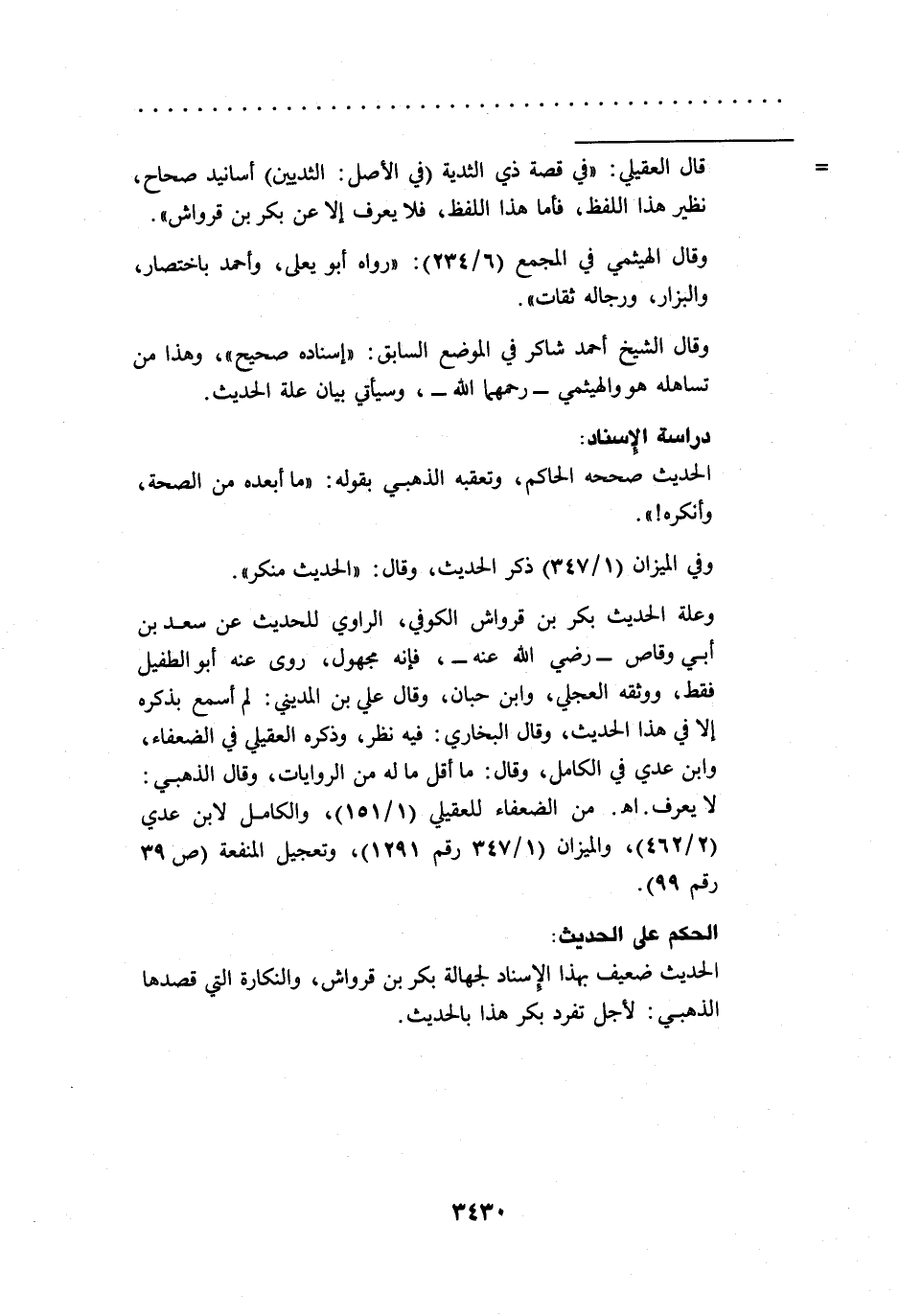 وعلة الحديث بكر بن قرواش الكوفي، الراوي للحديث عن سعد بن أبي وقاص -رضي الله عنه-، فإنه مجهول، روى عنه أبو الطفيل فقط، ووثقه العجلي، وابن حبان، وقال علي بن المديني: لم أسمع بذكره إلا في هذا الحديث، وقال البخاري: فيه نظر، وذكره العقيلي في الضعفاء، وابن عدي في الكامل، وقال: ما أقل ما له من الروايات، وقال الذهبي: لا يعرف. اهـ. من الضعفاء للعقيلي (1/ 151)، والكامل لابن عدي (2/ 462)، والميزان (1/ 347 رقم 1291)، وتعجيل المنفعة (ص 39 رقم 99).