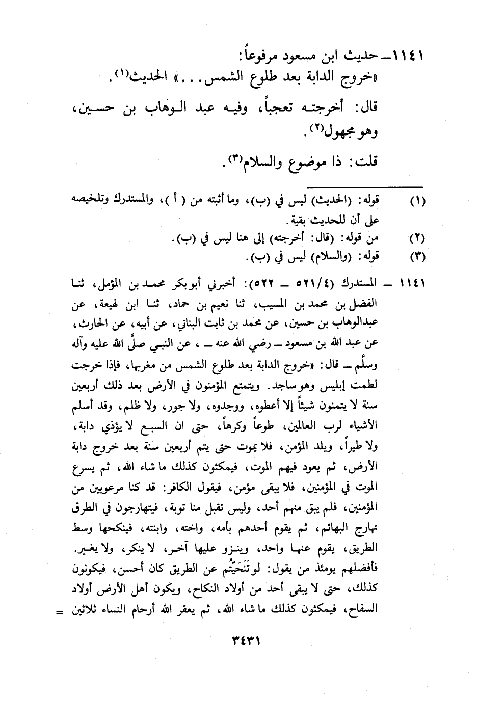 1141 - المستدرك (4/ 521 - 522): أخبرني أبو بكر محمد بن المؤمل، ثنا الفضل بن محمد بن المسيب، ثنا نعيم بن حماد، ثنا ابن لهيعة، عن عبد الوهاب بن حسين، عن محمد بن ثابت البناني، عن أبيه، عن الحارث، عن عبد الله بن مسعود -رضي الله عنه-، عن النبي صلى الله عليه وآله وسلم- قال: "خروج الدابة بعد طلوع الشمس من مغربها، فإذا خرجت لطمت إبليس وهو ساجد. ويتمتع المؤمنون في الأرض بعد ذلك أربعين سنة لا يتمنون شيئاً إلا أعطوه، ووجدوه، ولا جور، ولا ظلم، وقد أسلم الأشياء لرب العالمين، طوعاً وكرهاً، حتى أن السبع لا يؤذي دابة، ولا طيراً، ويلد المؤمن، فلا يموت حتى يتم أربعين سنة بعد خروج دابة الأرض، ثم يعود فيهم الموت، فيمكثون كذلك ما شاء الله، ثم يسرع الموت في المؤمنين، فلا يبقى مؤمن، فيقول الكافر: قد كنا مرعوبين من المؤمنين، فلم يبق منهم أحد، وليس تقبل منا توبة، فيتهارجون في الطرق تهارج البهائم، ثم يقوم أحدهم بأمه، وأخته، وابنته، فينكحها وسط الطريق، يقوم عنها واحد، وينزو عليها آخر، لا ينكر، ولا يغير.