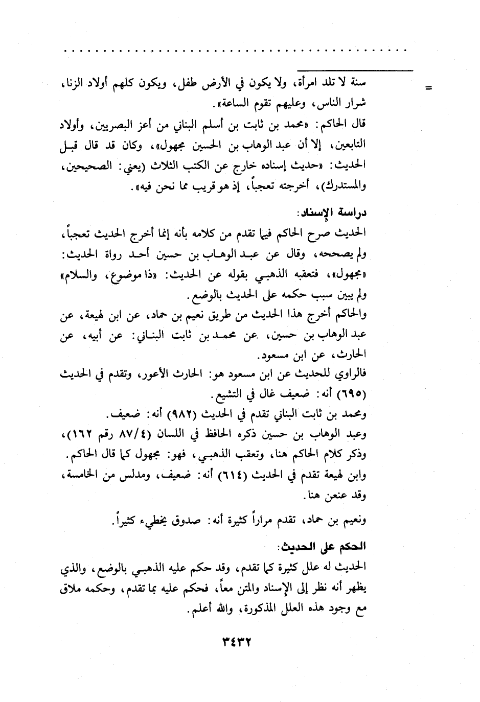 قال الحاكم: "محمد بن ثابت بن أسلم البناني من أعز البصريين، وأولاد التابعين، إلا أن عبد الوهاب بن الحسين مجهول"، وكان قد قال قبل الحديث: "حديث إسناده خارج عن الكتب الثلاث (يعني: الصحيحين، والمستدرك)، أخرجته تعجباً، إذ هو قريب مما نحن فيه".