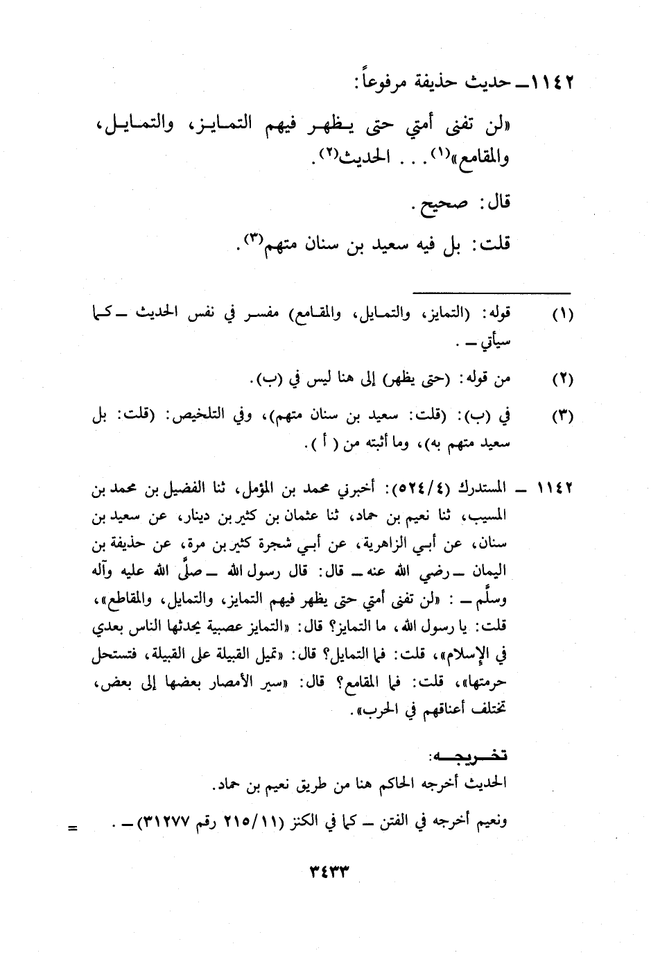 1142 - المستدرك (4/ 524): أخبرني محمد بن المؤمل، ثنا الفضيل بن محمد بن المسيب، ثنا نعيم بن حماد، ثنا عثمان بن كثير بن دينار، عن سعيد بن سنان، عن أبي الزاهرية، عن أبي شجرة كثير بن مرة، عن حذيفة بن اليمان -رضي الله عنه- قال: قال رسول الله -صلى الله عليه وآله وسلم-: "لن تفنى أمتي حتى يظهر فيهم التمايز، والتمايل، والمقاطع"، قلت: يا رسول الله، ما التمايز؟ قال: "التمايز عصبية يحدثها الناس بعدي في الإسلام"، قلت: فما التمايل؟ قال: "تميل القبيلة على القبيلة، فتستحل حرمتها"، قلت: فما المقامع؟ قال: "سير الأمصار بعضها إلى بعض، تختلف أعناقهم في الحرب".