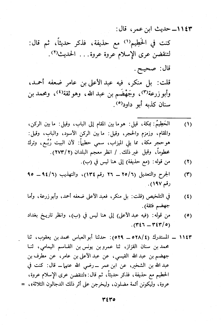1143 - المستدرك (4/ 528 - 529): حدثنا أبو العباس محمد بن يعقوب، ثنا محمد بن سنان القزاز، ثنا عمرو بن يونس بن القاسم اليمامي، ثنا جهضم بن عبد الله القيسي، عن عبد الأعلى بن عامر، عن مطرف بن عبد الله بن الشخير، عن ابن عمر -رضي الله عنهما- قال: كنت في الحطيم مع حذيفة، فذكر حديثاً، ثم قال: "لتنقضن عرى الِإسلام عروة، عروة، وليكونن أئمة مضلون، وليخرجن على أثر ذلك الدجالون الثلاثة"، =