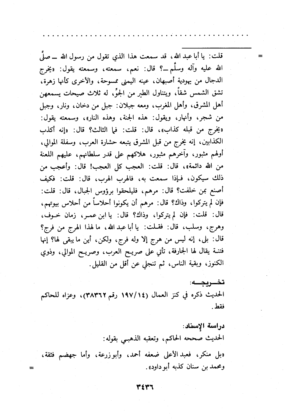 = قلت: يا أبا عبد الله، قد سمعت هذا الذي تقول من رسول الله -صلى الله عليه وآله وسلم-؟ قال: نعم، سمعته، وسمعته يقول: "يخرج الدجال من يهودية أصبهان، عينه اليمنى ممسوحة، والأخرى كأنها زهرة، تشق الشمس شقاً، ويتناول الطير من الجوِّ، له ثلاث صيحات يسمعهن أهل المشرق، وأهل المغرب، ومعه جبلان: جبل من دخان، ونار، وجبل من شجر، وأنهار، ويقول: هذه الجنة، وهذه النار"، وسمعته يقول: "يخرج من قبله كذاب"، قال: قلت: فما الثالث؟ قال: "إنه أكذب الكذابين، إنه يخرج من قبل المشرق يتبعه حشارة العرب، وسفلة الموالي، أولهم مثبور، وآخرهم مثبور، هلاكهم على قدر سلطانهم، عليهم اللعنة من الله دائمة"، قال: قلت: العجب كل العجب! قال: وأعجب من ذلك سيكون، فإذا سمعت به، فالهرب الهرب، قال: قلت: فكيف أصنع بمن خلفت؟ قال: مرهم، فليلحقوا برؤوس الجبال، قال: قلت: فإن لم يتركوا، وذاك؟ قال: مرهم أن يكونوا أحلاساً من أحلاس بيوتهم، قال: قلت: فإن لم يتركوا، وذاك؟ قال: يا ابن عمر، زمان خوف، وهرج، وسلب، قال: فقلت: يا أبا عبد الله، ما لهذا الهرج من فرج؟ قال: بلى، إنه ليس من هرج إلا وله فرج، ولكن، أين ما يبقى لها؟ إنها فتنة يقال لها الجارفة، تأتي على صريح العرب، وصريح الموالي، وذوي الكنوز، وبقية الناس، ثم تنجلي عن أقل من القليل.