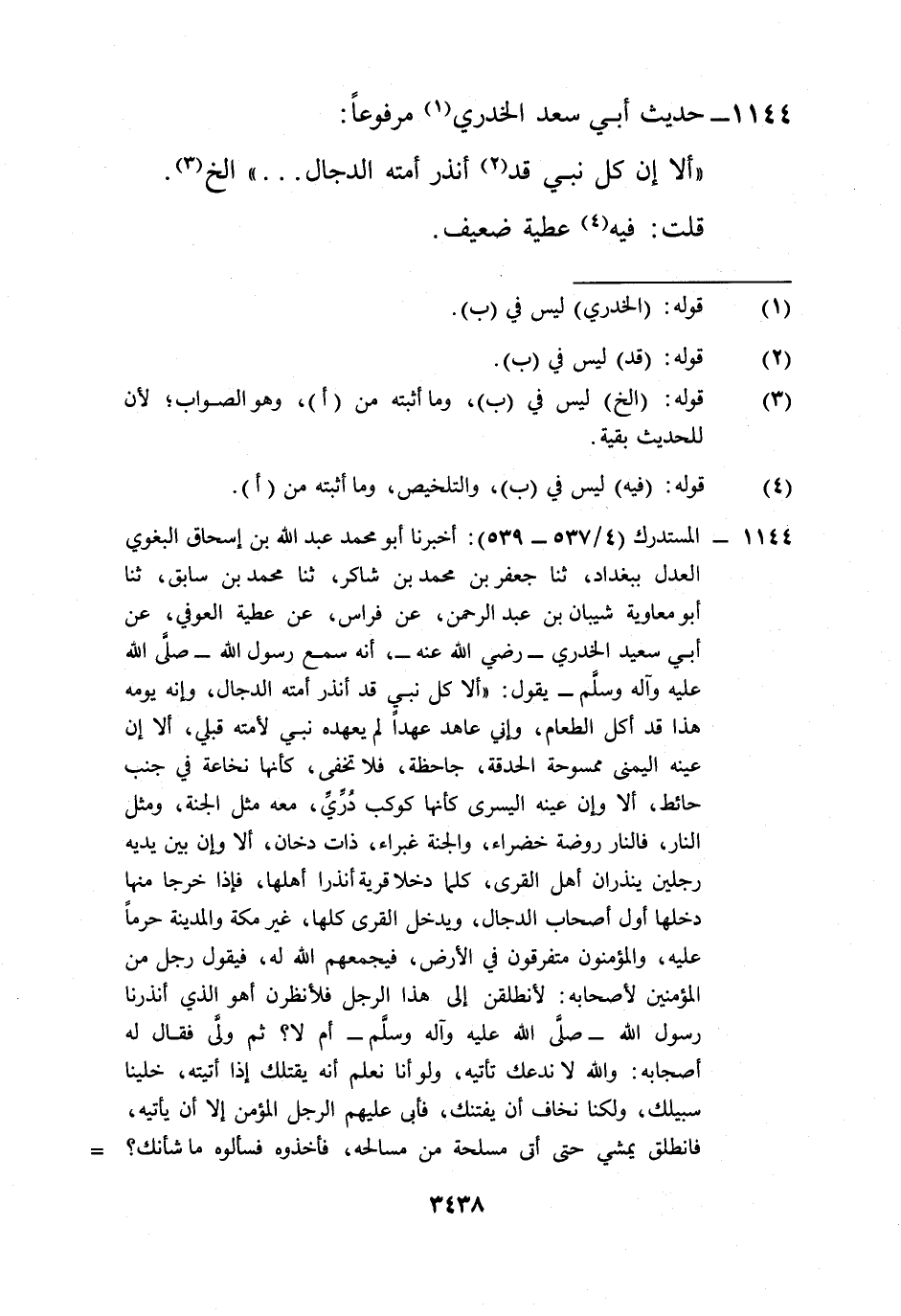 1144 - المستدرك (4/ 537 - 539): أخبرنا أبو محمد عبد الله بن إسحاق البغوي العدل ببغداد، ثنا جعفر بن محمد بن شاكر، ثنا محمد بن سابق، ثنا أبو معاوية شيبان بن عبد الرحمن، عن فراس، عن عطية العوفي، عن أبي سعيد الخدري -رضي الله عنه- أنه سمع رسول الله -صلى الله عليه وآله وسلم- يقول: "ألا على نبي قد أنذر أمته الدجال، وإنه يومه هذا قد أكل الطعام، وإني عاهد عهداً لم يعهده نبي لأمته قبلي، ألا إن عينه اليمنى ممسوحة الحدقة، جاحظة، فلا تخفى، كأنها نخاعة في جنب حائط، ألا وإن عينه اليسرى كأنها كوكب دُرِّيِّ، معه مثل الجنة، ومثل النار، فالنار روضة خضراء، والجنة غبراء، ذات دخان، ألا وإن بين يديه رجلين ينذران أهل القرى، كلما دخلا قرية أنذرا أهلها، فإذا خرجا منها دخلها أول أصحاب الدجال، ويدخل القرى كلها، غير مكة والمدينة حرماً عليه، والمؤمنون متفرقون في الأرض، فيجمعهم الله له، فيقول رجل من المؤمنين لأصحابه: لأنطلقن إلى هذا الرجل فلأنظرن أهو الذي أنذرنا رسول الله -صلى الله عليه وآله وسلم- أم لا؟ ثم ولَّى فقال له أصحابه: والله لا ندعك تأتيه، ولو أنا نعلم أنه يقتلك إذا أتيته، خلينا سبيلك، ولكنا نخاف أن يفتنك، فأبى عليهم الرجل المؤمن إلا أن يأتيه، فانطلق يمشي حتى أتى مسلحة من مسالحه، فأخذوه فسألوه ما شأنك؟ =