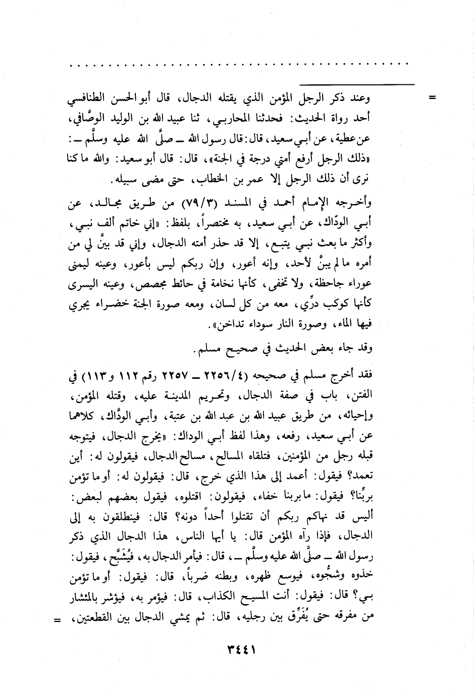 = وعند ذكر الرجل المؤمن الذي يقتله الدجال، قال أبو الحسن الطنافسي أحد رواة الحديث: فحدثنا المحاربي، ثنا عبيد الله بن الوليد الوصَّافي، عن عطية، عن أبي سعيد، قال: قال رسول الله -صلى الله عليه وسلَّم-: "ذلك الرجل أرفع أمتي درجة في الجنة"، قال: قال أبو سعيد: والله ما كنا نرى أن ذلك الرجل إلا عمر بن الخطاب، حتى مضى سبيله.