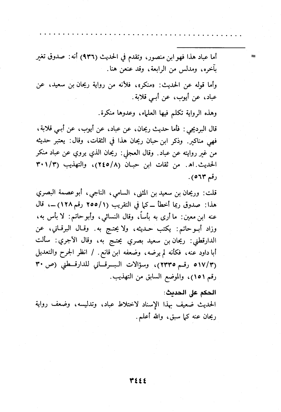 وأما قوله عن الحديث: "منكر"، فلأنه من رواية ريحان بن سعيد، عن عباد، عن أيوب، عن أبي قلابة.