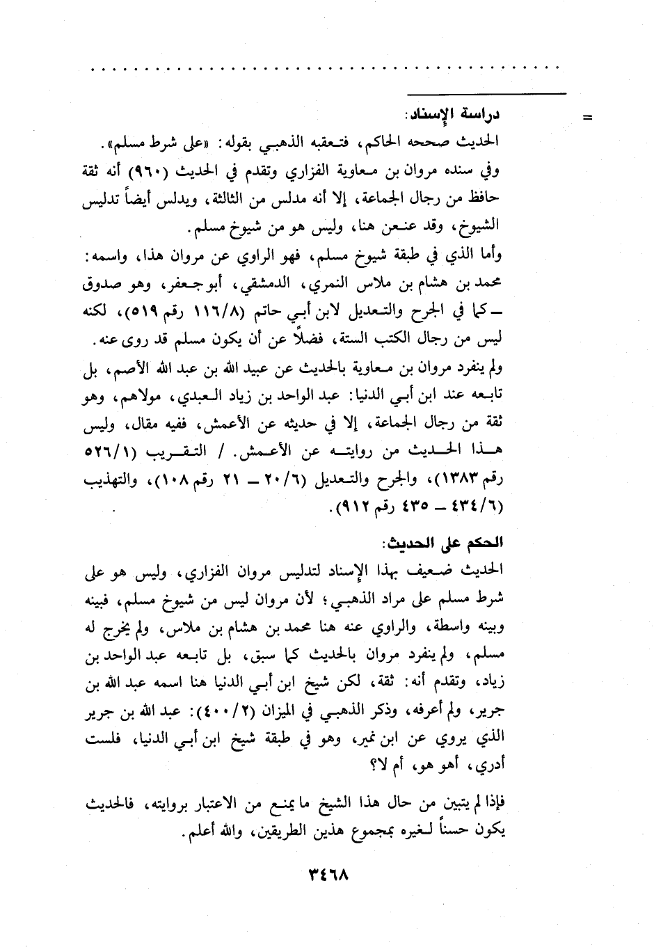 وأما الذي في طبقة شيوخ مسلم، فهو الراوي عن مروان هذا، واسمه: محمد بن هشام بن ملاس النمري، الدمشقي، أبو جعفر، وهو صدوق -كما في الجرح والتعديل لابن أبي حاتم (8/ 116 رقم 519)، لكنه ليس من رجال الكتب الستة، فضلاً عن أن يكون مسلم قد روى عنه.