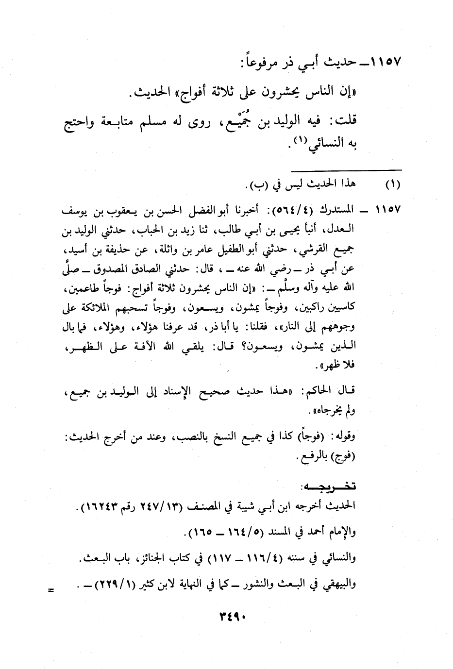 1157 - المستدرك (4/ 564): أخبرنا أبو الفضل الحسن بن يعقوب بن يوسف العدل، أنبأ يحيى بن أبي طالب، ثنا زيد بن الحباب، حدثني الوليد بن جميع القرشي، حدثني أبو الطفيل عامر بن واثلة، عن حذيفة بن أسيد، عن أبي ذر -رضي الله عنه-، قال: حدثني الصادق المصدوق -صلى الله عليه وآله وسلم-: "إن الناس يحشرون ثلاثة أفواج: فوجاً طاعمين، كاسيين راكبين، وفوجاً يمشون، ويسعون، وفوجاً تسحبهم الملائكة على وجوههم إلى النار"، فقلنا: يا أبا ذر، قد عرفنا هؤلاء، وهؤلاء، فما بال الذين يمشون، ويسعون؟ قال: يلقي الله الآفة على الظهر، فلا ظهر".