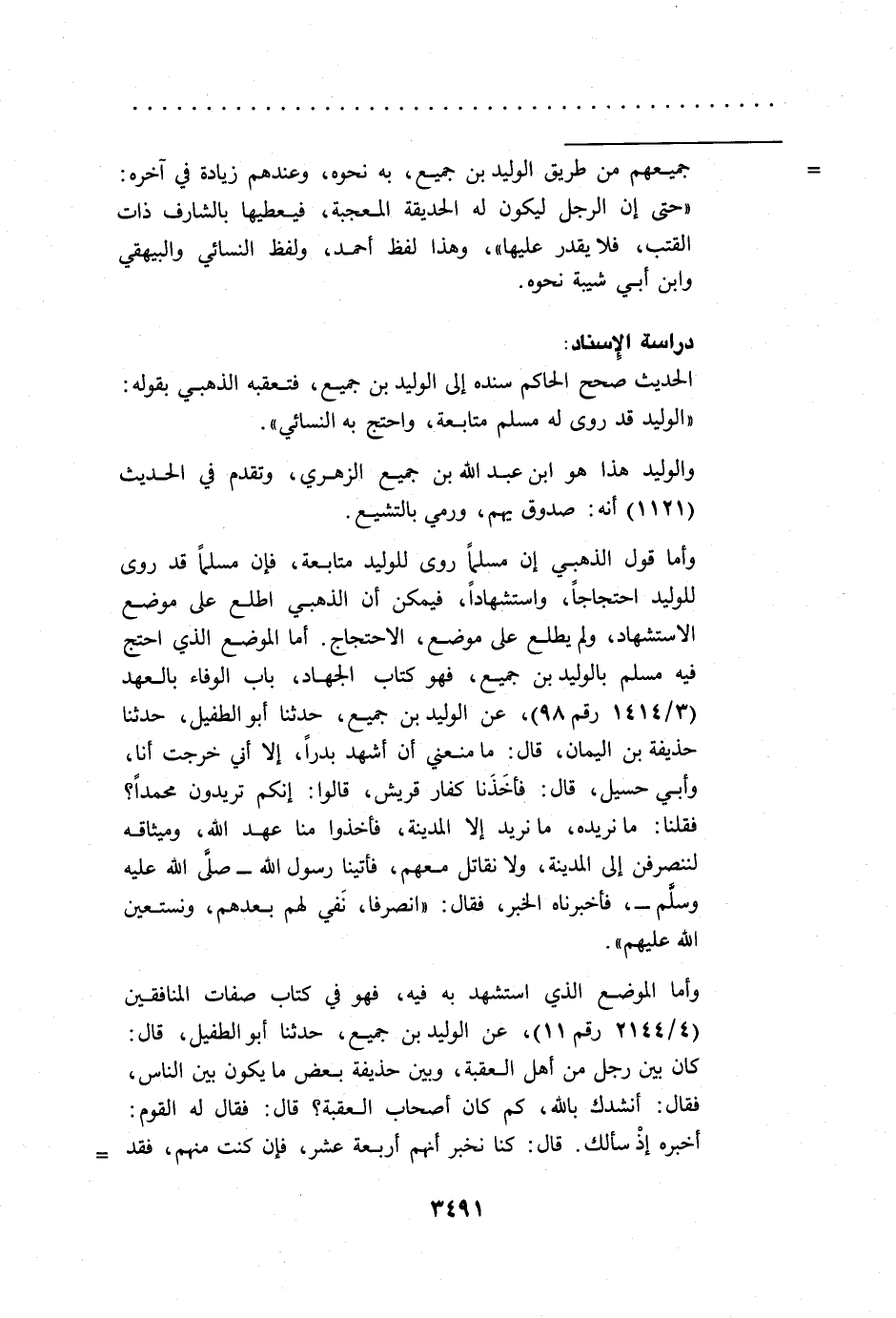 وأما قول الذهبي إن مسلماً روى للوليد متابعة، فإن مسلماً قد روى للوليد احتجاجاً، واستشهاداً، فيمكن أن الذهبي اطلع على موضع الاستشهاد، ولم يطلع على موضع، الاحتجاج. أما الموضع الذي احتج فيه مسلم بالوليد بن جميع، فهو كتاب الجهاد، باب الوفاء بالعهد (3/ 1414 رقم 98)، عن الوليد بن جميع، حدثنا أبو الطفيل، حدثنا حذيفة بن اليمان، قال: ما منعني أن أشهد بدراً، إلا أني خرجت أنا، وأبي حسيل، قال: فأخَذَنا كفار قريش، قالوا: إنكم تريدون محمداً؟ فقلنا: ما نريده، ما نريد إلا المدينة، فأخذوا منا عهد الله، وميثاقه لننصرفن إلى المدينة، ولا نقاتل معهم، فأتينا رسول الله -صلى الله عليه وسلم-، فأخبرناه الخبر، فقال: "انصرفا، نَفي لهم بعدهم، ونستعين الله عليهم".