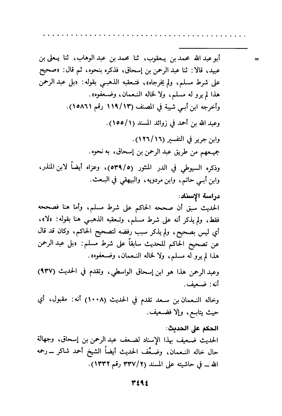 = أبو عبد الله محمد بن يعقوب، ثنا محمد بن عبد الوهاب، ثنا يعلى بن عبيد، قالا: ثنا عبد الرحمن بن إسحاق، فذكره بنحوه، ثم قال: "صحيح على شرط مسلم، ولم يخرجاه"، فتعقبه الذهبي بقوله: "بل عبد الرحمن هذا لم يرو له مسلم، ولا لخاله النعمان، وضعفوه".