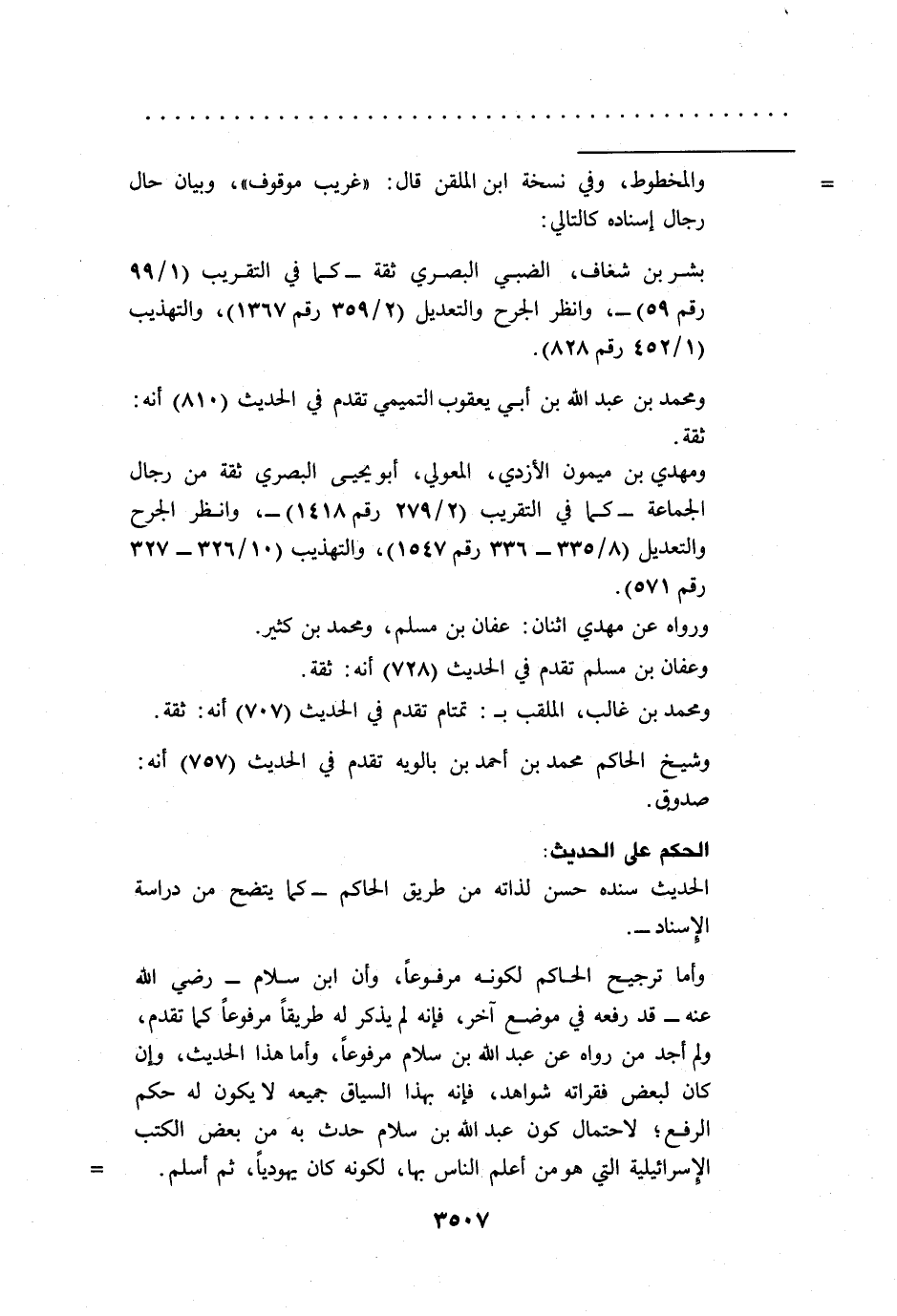 وأما ترجيح الحاكم لكونه مرفوعا، مرفوعاً وأن ابن سلام -رضي الله عنه- قد رفعه في موضع آخر، فإنه لم يذكر له طريقاً مرفوعاً كما تقدم، ولم أجد من رواه عن عبد الله بن سلام مرفوعاً، وأما هذا الحديث، وإن كان لبعض فقراته شواهد، فإنه بهذا السياق جميعه لا يكون له حكم الرفع؛ لاحتمال كون عبد الله بن سلام حدث به من بعض الكتب الإسرائيلية التي هو من أعلم الناس بها، لكونه كان يهودياً، ثم أسلم. =