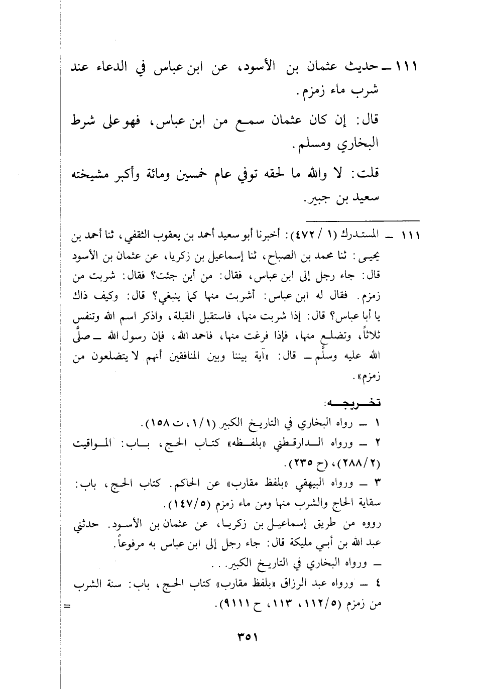 111 - المستدرك (1/ 472): أخبرنا أبو سعيد أحمد بن يعقوب الثقفي، ثنا أحمد بن يحيى: ثنا محمد بن الصباح، ثنا إسماعيل بن زكريا، عن عثمان بن الأسود قال: جاء رجل إلى ابن عباس، فقال: من أين جئت؟ فقال: شربت من زمزم. فقال له ابن عباس: أشربت منها كما ينبغي؟ قال: وكيف ذاك يا أبا عباس؟ قال: إذا شربت منها، فاستقبل القبلة، واذكر اسم الله وتنفس ثلاثاً، وتضلع منها، فإذا فرغت منها، فاحمد الله، فإن رسول الله -صلى الله عليه وسلم- قال: "آية بيننا وبين المنافقين أنهم لا يتضلعون من زمزم".