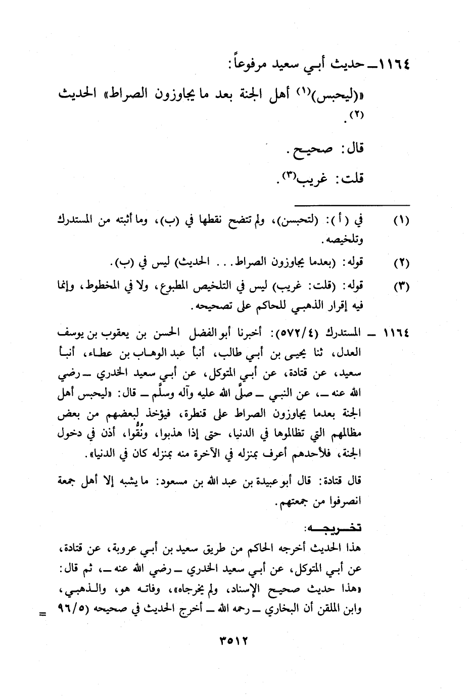 1164 - المستدرك (4/ 572): أخبرنا أبو الفضل الحسن بن يعقوب بن يوسف العدل، ثنا يحيى بن أبي طالب، أنبأ عبد الوهاب بن عطاء، أنبأ سعيد، عن قتادة، عن أبي المتوكل، عن أبي سعيد الخدري -رضي الله عنه-، عن النبي -صلى الله عليه وآله وسلم- قال: "ليحبس أهل الجنة بعدما يجاوزون الصراط على قنطرة، فيؤخذ لبعضهم من بعض مظالمهم التي تظالموها في الدنيا، حتى إذا هذبوا، ونُقُّوا، أذن في دخول الجنة، فلأحدهم أعرف بمنزله في الآخرة منه بمنزله كان في الدنيا".