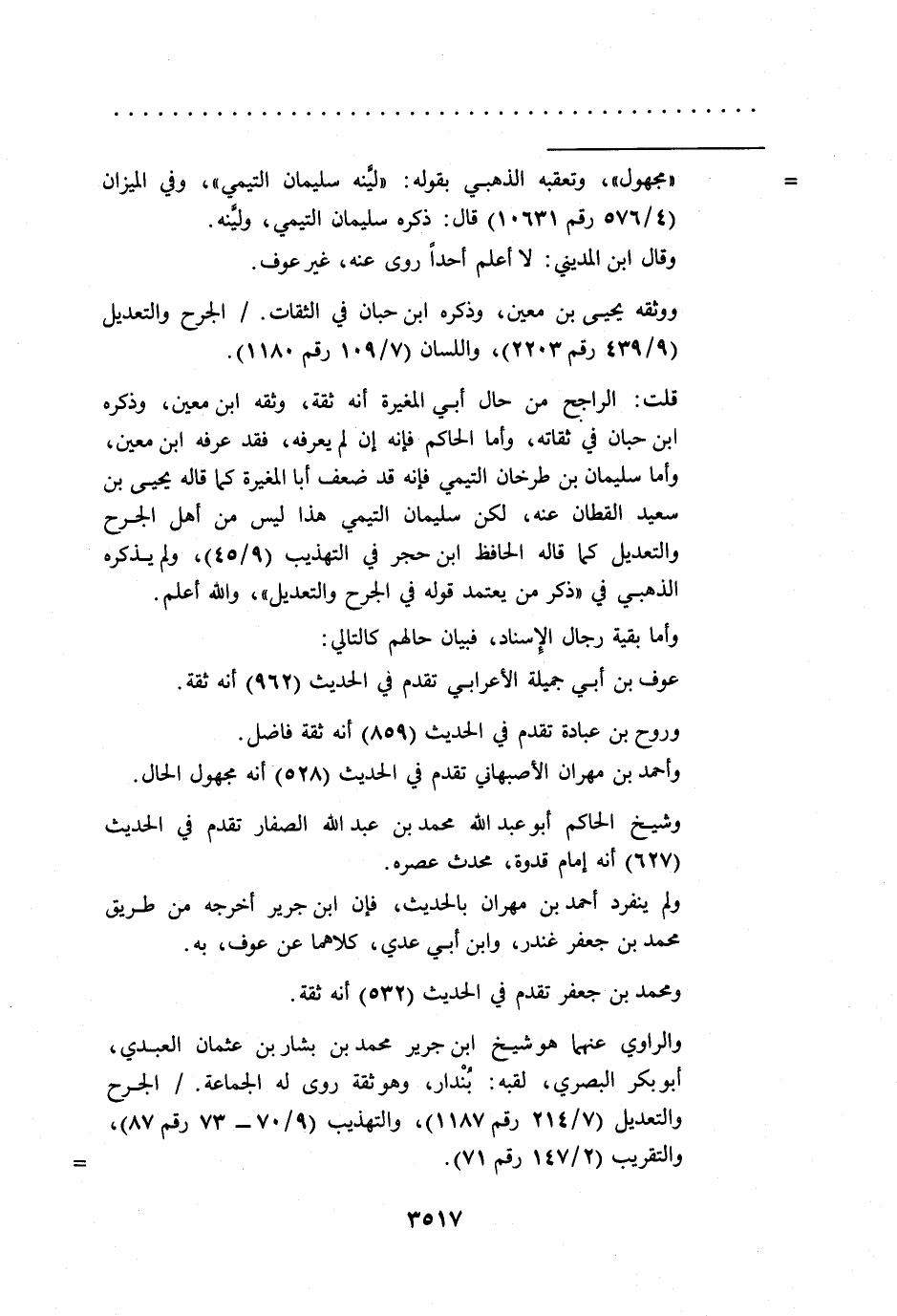 = "مجهول"، وتعقبه الذهبي بقوله: "ليَّنه سليمان التيمي"، وفي الميزان (4/ 576 رقم 10631) قال: ذكره سليمان التيمي، وليَّنه.