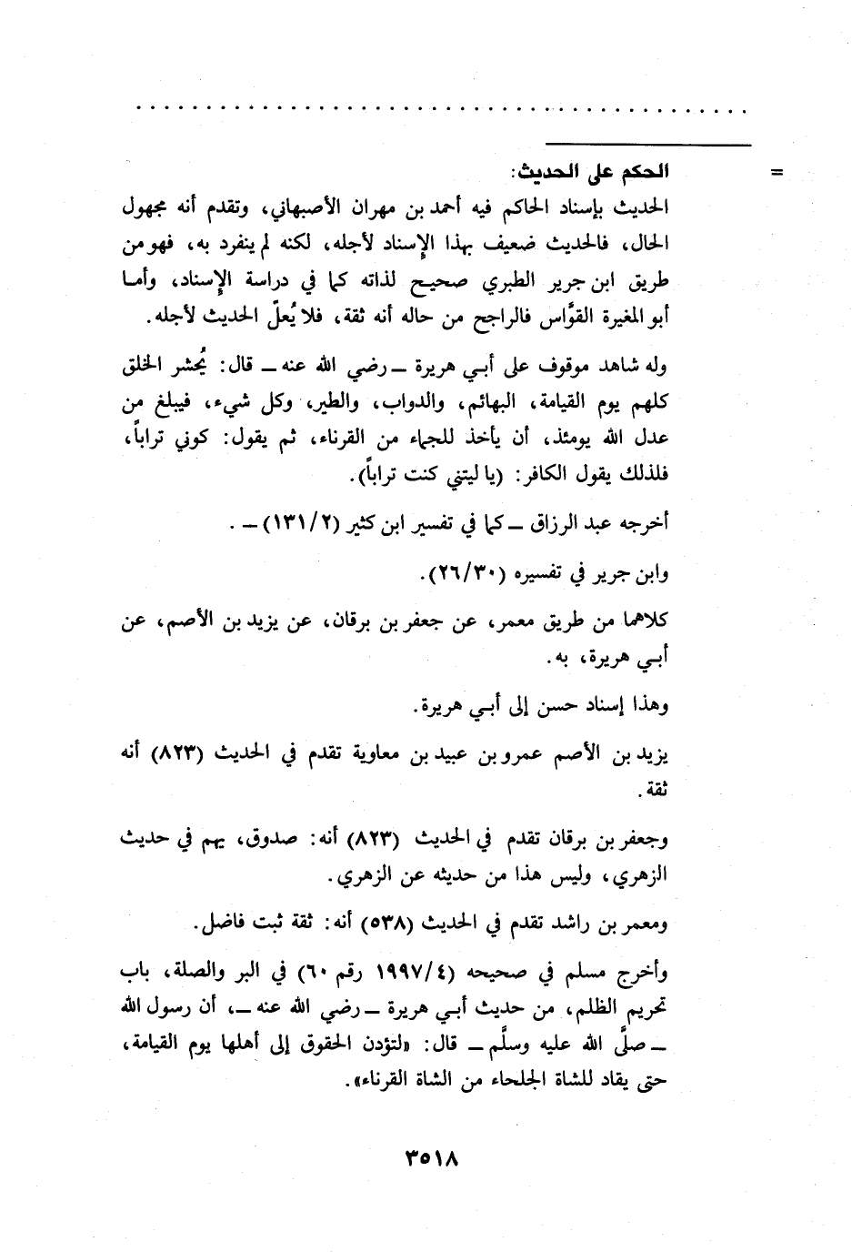 وأخرج مسلم في صحيحه (4/ 1997 رقم 60) في البر والصلة، باب تحريم الظلم، من حديث أبي هريرة -رضي الله عنه- أن رسول الله -صلى الله عليه وسلم- قال: "لتؤدن الحقوق إِلى أهلها يوم القيامة، حتى يقاد للشاة الجلحاء من الشاة القرناء".