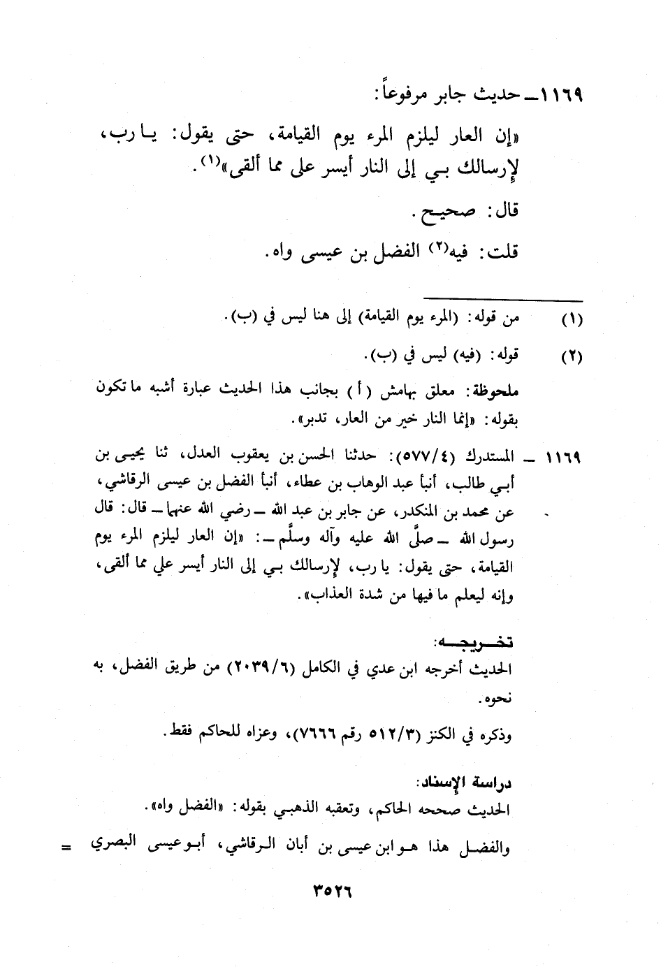 1169 - المستدرك (4/ 577): حدثنا الحسن بن يعقوب العدل، ثنا يحيى بن أبي طالب، أنبأ عبد الوهاب بن عطاء، أنبأ الفضل بن عيسى الرقاشي، عن محمد بن المنكدر، عن جابر بن عبد الله -رضي الله عنهما- قال: قال رسول الله -صلى الله عليه وآله وسلم-: "إن العار ليلزم المرء يوم القيامة، حتى يقول: يا رب، لإرسالك بي إلى النار أيسر علي مما ألقى، وإنه ليعلم ما فيها من شدة العذاب".