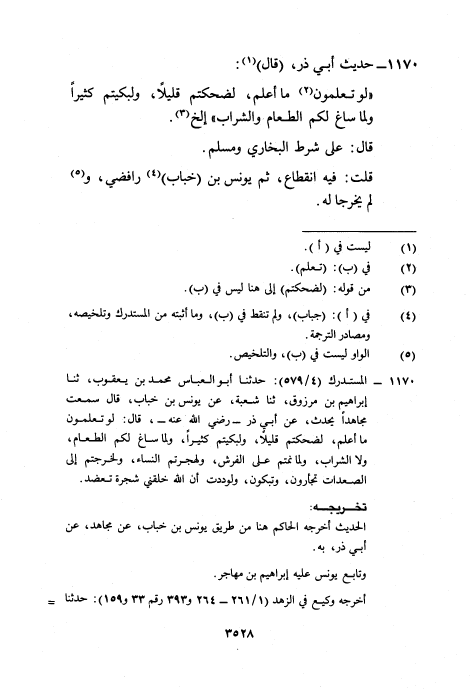 1170 - المستدرك (4/ 579): حدثنا أبو العباس محمد بن يعقوب، ثنا إبراهيم بن مرزوق، ثنا شعبة، عن يونس بن خباب، قال سمعت مجاهداً يحدث، عن أبي ذر -رضي الله عنه-، قال: لو تعلمون ما أعلم، لضحكتم قليلاً، ولبكيتم كثيراً، ولما ساغ لكم الطعام، ولا الشراب، ولما نمتم على الفرش، ولهجرتم النساء، ولخرجتم إلى الصعدات تجأرون، وتبكون، ولوددت أن الله خلقني شجرة تعضد.
