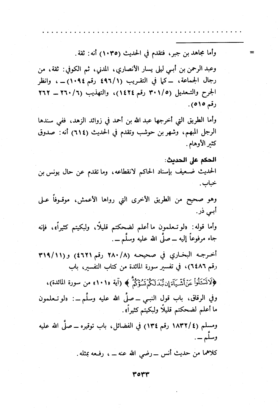 وأما قوله: "لو تعلمون ما أعلم لضحكتم قليلاً، ولبكيتم كثيراً"، فإنه جاء مرفوعاً إليه -صلى الله عليه وسلم-.