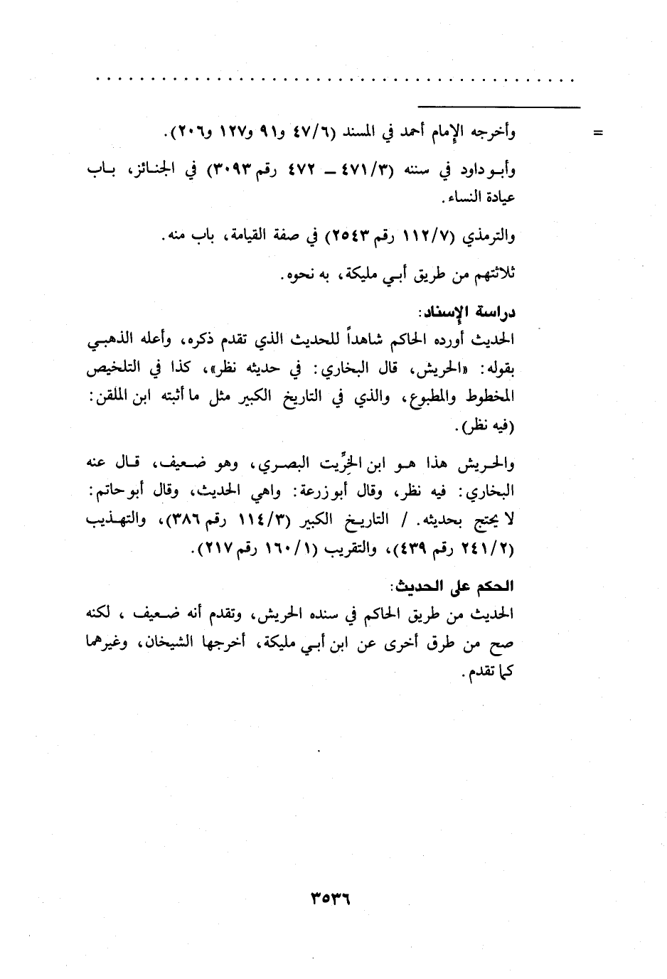 والحريش هذا هو ابن الخِرِّيت البصري، وهو ضعيف، قال عنه البخاري: فيه نظر، وقال أبو زرعة: واهي الحديث، وقال أبو حاتم: لا يحتج بحديثه. / التاريخ الكبير (3/ 114 رقم 386)، والتهذيب (2/ 241 رقم 439)، والتقريب (1/ 160 رقم 217).