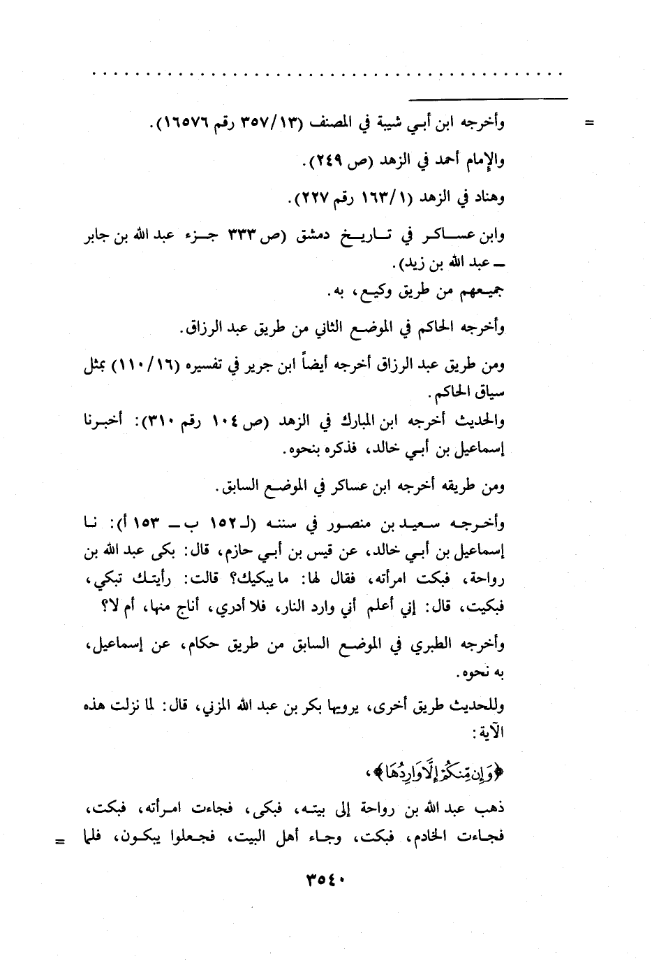 وأخرجه سعيد بن منصور في سننه (لـ 152 ب- 153 أ): نا إسماعيل بن أبي خالد، عن قيس بن أبي حازم، قال: بكى عبد الله بن رواحة، فبكت امرأته، فقال لها: ما يبكيك؟ قالت: رأيتك تبكي، فبكيت، قال: إني أعلم أني وارد النار، فلا أدري، أناج منها، أم لا؟