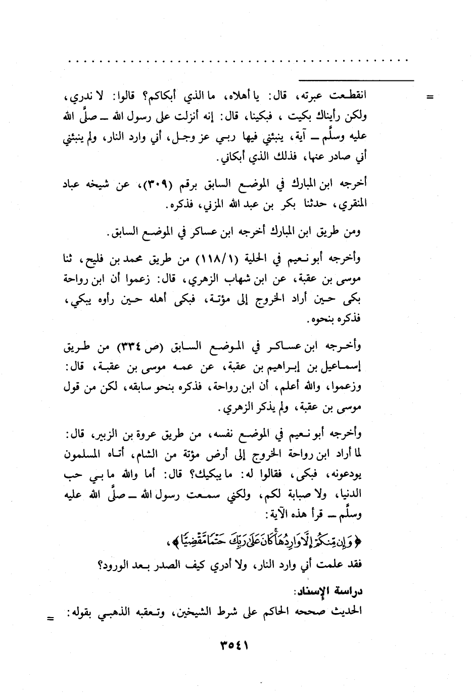وأخرجه أبو نعيم في الموضع نفسه، من طريق عروة بن الزبير، قال: لما أراد ابن رواحة الخروج إلى أرض مؤتة من الشام، أتاه المسلمون يودعونه، فبكى، فقالوا له: ما يبكيك؟ قال: أما والله ما بي حب الدنيا، ولا صبابة لكم، ولكني سمعت رسول الله -صلى الله عليه وسلم- قرأ هذه الآية: