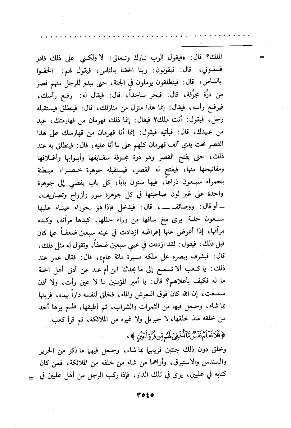 = الملك؟ قال: "فيقول الرب تبارك وتعالى: لا ولكني على ذلك قادر فسلوني، قال: فيقولون: ربنا الحقنا بالناس، فيقول لهم: الحقوا بالناس، قال: فينطلقون يرملون في الجنة، حتى يبدو للرجل منهم قصر من درَّة مجوَّفة، قال: فيخر ساجداً، قال: فيقال له: ارفع رأسك، فيرفع رأسه، فيقال: إنما هذا منزل من منازلك، قال: فينطلق فيستقبله رجل، فيقول: أنت ملك؟ فيقال: إنما ذلك قهرمان من قهارمتك، عبد من عبيدك، قال: فيأتيه فيقول: إنما أنا قهرمان من قهارمتك على هذا القصر تحت يدي ألف قهرمان كلهم على ما أنا عليه، قال: فينطلق به عند ذلك، حتى يفتح القصر وهو درة مجوفة سقايفها وأبوابها وأغلاقها ومفاتيحها منها، فيفتح له القصر، فيستقبله جوهرة خضراء مبطنة بحمراء سبعون ذراعاً، فيها ستون باباً، كل باب يفضي إلى جوهرة واحدة على غير لون صاحبتها في كل جوهرة سرر وأزواج وتصاريف، -أو قال: ووصائف-، قال: فيدخل فإذا هو بحوراء عيناء عليها سبعون حلة يرى مخ ساقها من وراء حللها، كبدها مرآته، وكبده مرآتها، إذا أعرض عنها إعراضه ازدادت في عينه سبعين ضعفاً عما كان قبل ذلك، فيقول: لقد ازددت في عيني سبعين ضعفاً، وتقول له مثل ذلك، قال: فيشرف ببصره على ملكه مسيرة مائة عام"، قال: فقال عمر عند ذلك: يا كعب ألا تسمع إلى ما يحدثنا ابن أم عبد عن أدنى أهل الجنة ما له فكيف بأعلاهم؟ قال: يا أمير المؤمنين ما لا عين رأت، ولا أذن سمعت، إن الله كان فوق العرش والماء، فخلق لنفسه داراً بيده، فزينها بما شاء، وجعل فيها من الثمرات والشراب، ثم أطبقها، فلم يرها أحد من خلقه منذ خلقها، لا جبريل ولا غيره من الملائكة، ثم قرأ كعب.