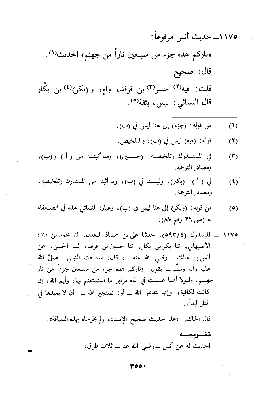 1175 - المستدرك (4/ 593): حدثنا علي بن حمشاذ العدل، ثنا محمد بن مندة الأصبهاني، ثنا بكر بن بكار، ثنا حسين بن فرقد، ثنا الحسن، عن أنس بن مالك -رضي الله عنه-، قال: سمعت النبى -صلى الله عليه وآله وسلم- يقول: "ناركم هذه جزء من سبعين جزءاً من نار جهنم، ولولا أنها غمست في الماء مرتين ما استمتعتم بها، وأيم الله، إن كانت لكافية، وإنها لتدعو الله -أو: تستجير الله-: أن لا يعيدها في النار أبداً".