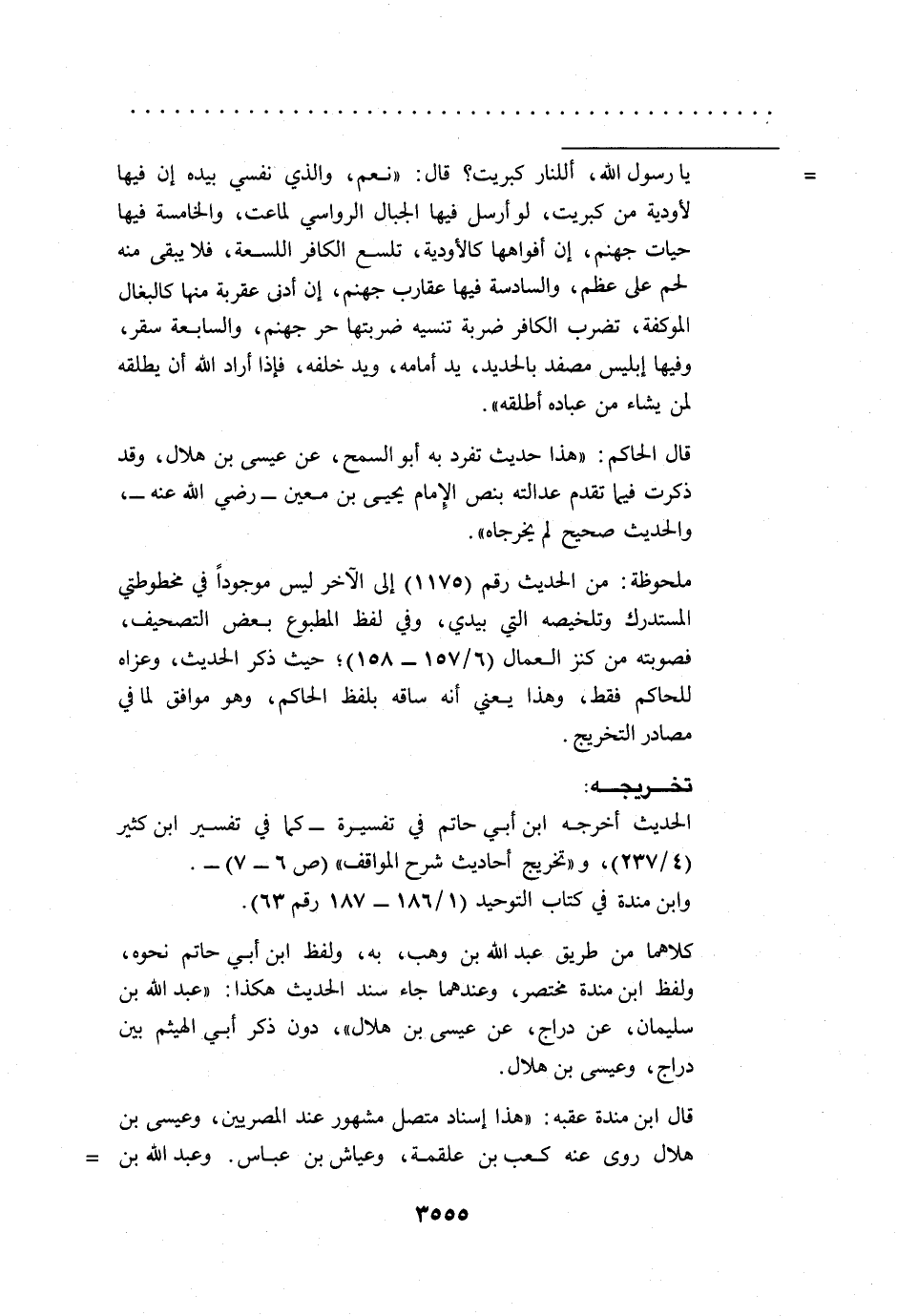 = يا رسول الله، أللنار كبريت؟ قال: "نعم، والذي نفسي بيده إن فيها لأودية من كبريت، لو أرسل فيها الجبال الرواسي لماعت، والخامسة فيها حيات جهنم، إن أفواهها كالأودية، تلسع الكافر اللسعة، فلا يبقى منه لحم على عظم، والسادسة فيها عقارب جهنم، إن أدنى عقربة منها كالبغال الموكفة، تضرب الكافر ضربة تنسيه ضربتها حر جهنم، والسابعة سقر، وفيها إبليس مصفد بالحديد، يد أمامه، ويد خلفه، فإذا أراد الله أن يطلقه لمن يشاء من عباده أطلقه".