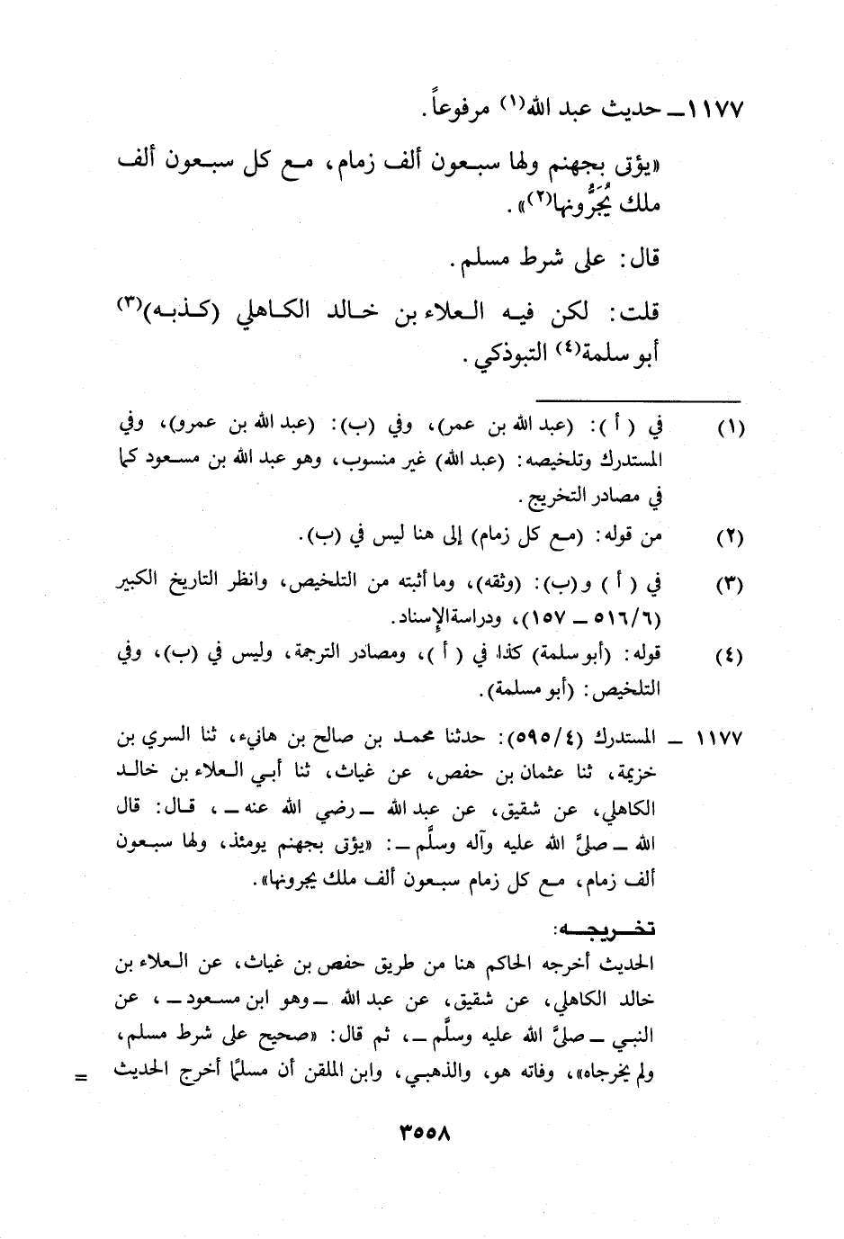 1177 - المستدرك (4/ 595): حدثنا محمد بن صالح بن هانيء، ثنا السري بن خزيمة، ثنا عثمان بن حفص، عن غياث، ثنا أبي العلاء بن خالد الكاهلي، عن شقيق، عن عبد الله -رضي الله عنه-، قال: قال الله -صلى الله عليه وآله وسلم-: "يؤتى بجهنم يومئذ، ولها سبعون ألف زمام، مع كل زمام سبعون ألف ملك يجرونها".